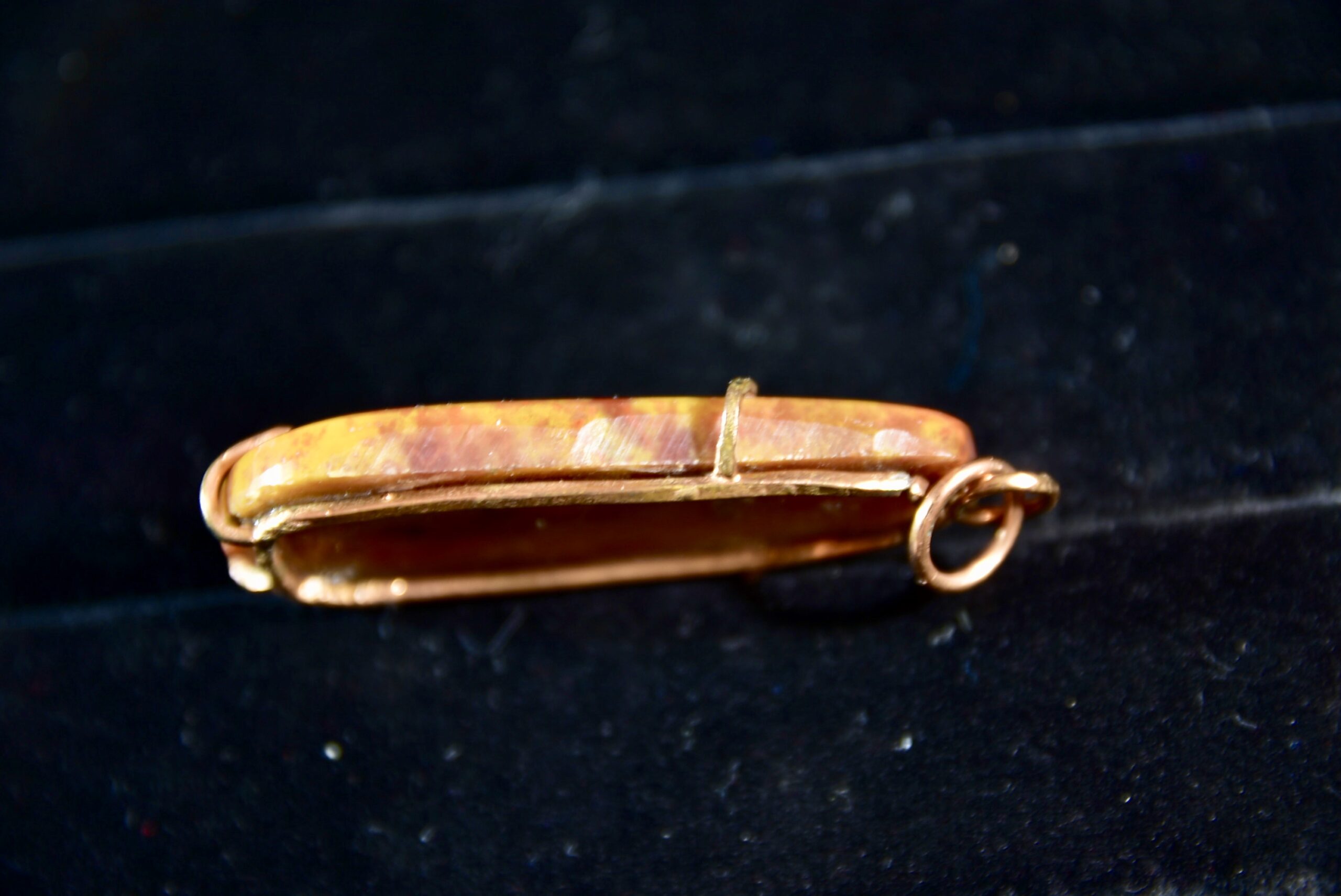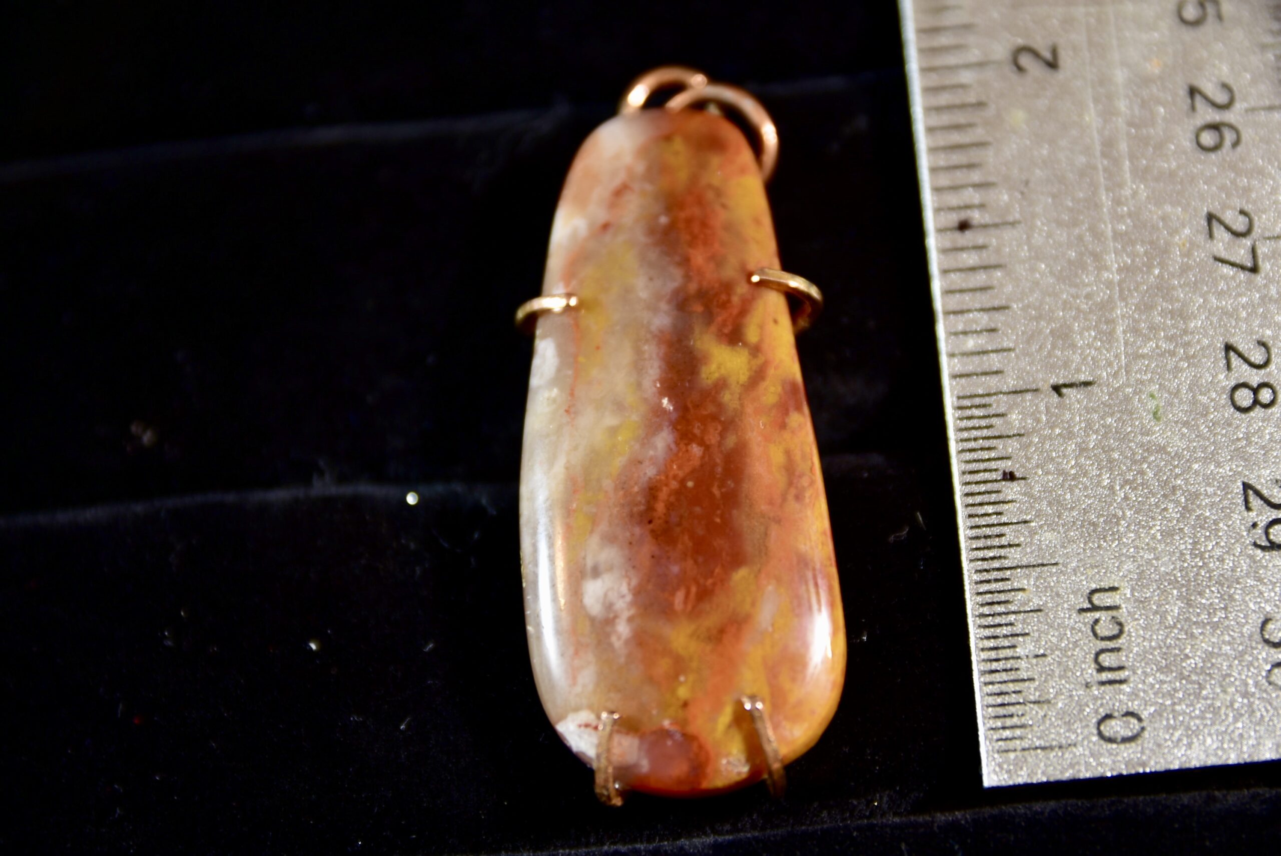 This is a nice piece of agate that Jake found while out in Arizona. The stone has a blend of colors including red, orange, brown and white. It is set with square copper wire framing the back with prongs to hold the stone in place.
