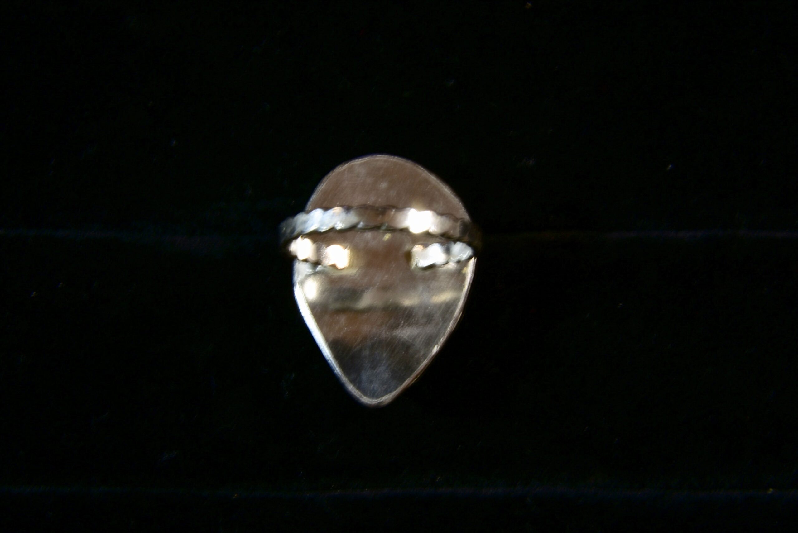 This is a piece of Amethyst that came from a rock that Jake dug from a vein at an abandoned gold mine in New Mexico. The vein had been heavily worked so it wasn’t easy to get to the vein and the gem material had to be chiseled out of solid rock. This piece has a very subtle color that fades into the white quartz for a great look. The stone is set in sterling silver with a fine silver scalloped bezel and the ring stock is flattened sterling silver twist wire. The ring size is 6.