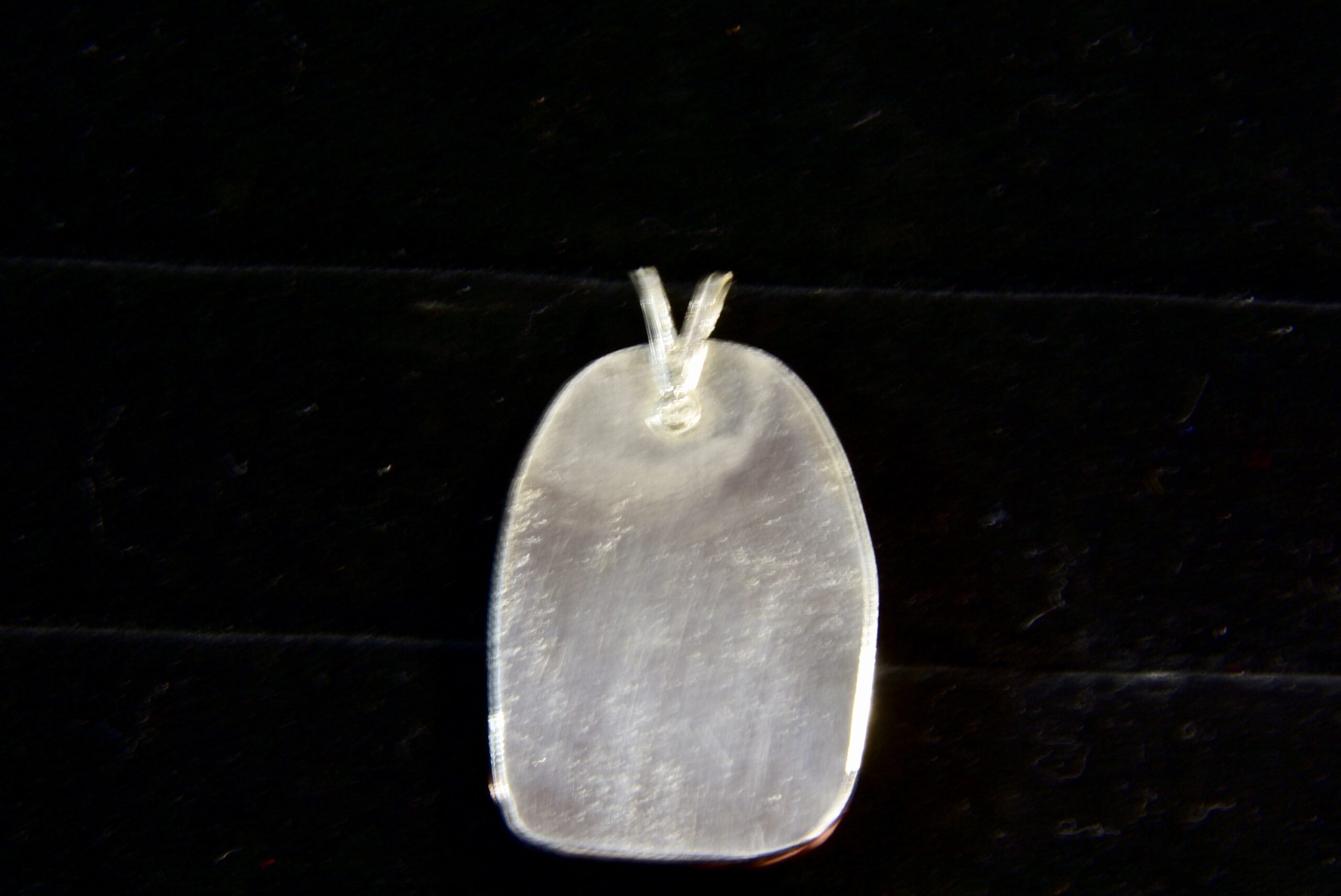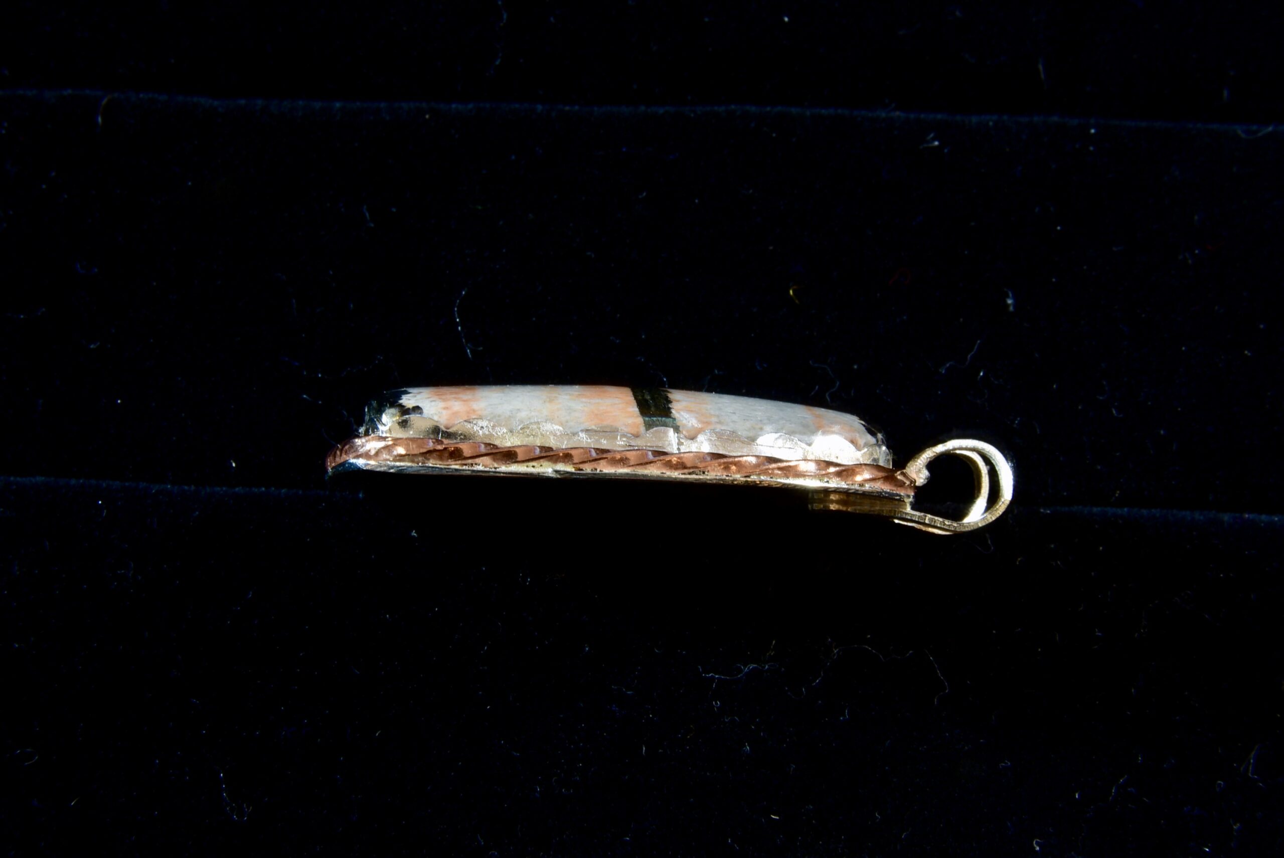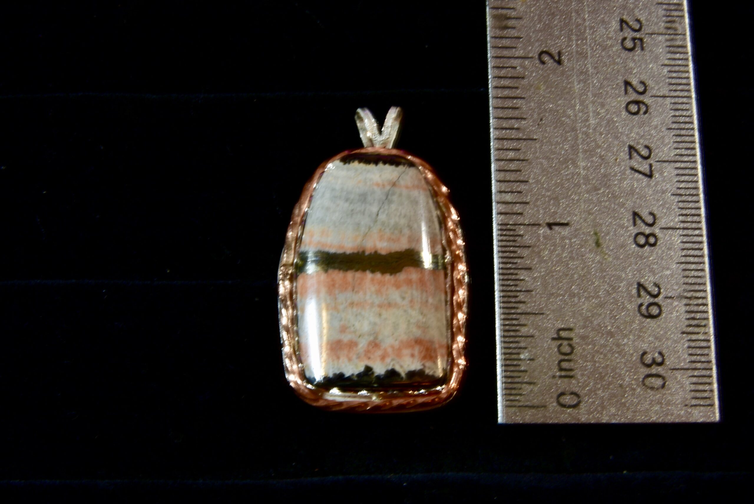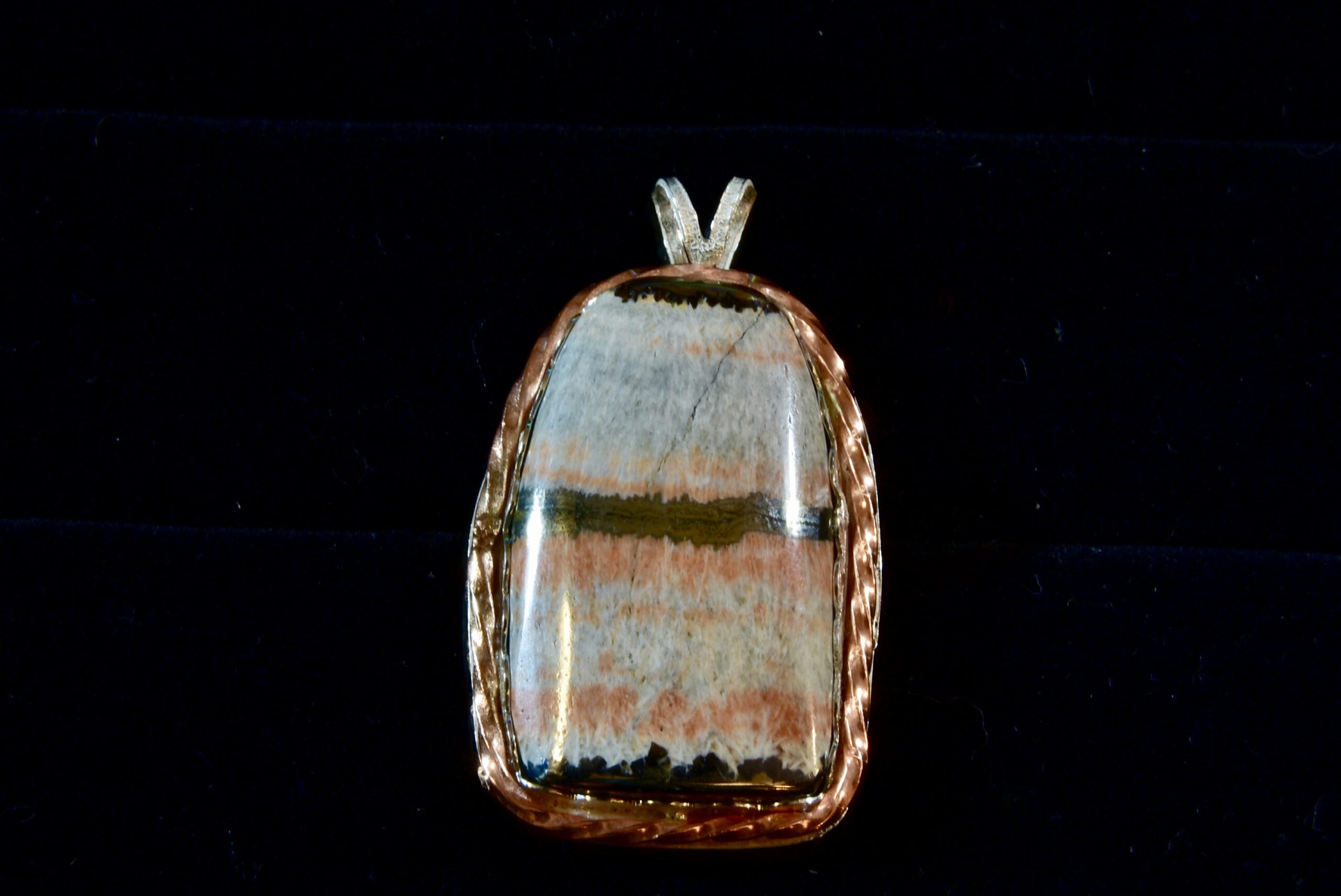 Jake got this stone from a rock shop in Utah and was told that the stone was called Barite, and was found only in England. Although Barite can occur in a crystal form and is found throughout the world, this type of Barite is rare. this stone has great colors, with blab striping on the top, middle and bottom, with the rest of the the stone grey tinged with pink. The stone is set in sterling silver with a solid silver back, and a scalloped sterling bezel surrounded by a twisted square copper wire as an accent.