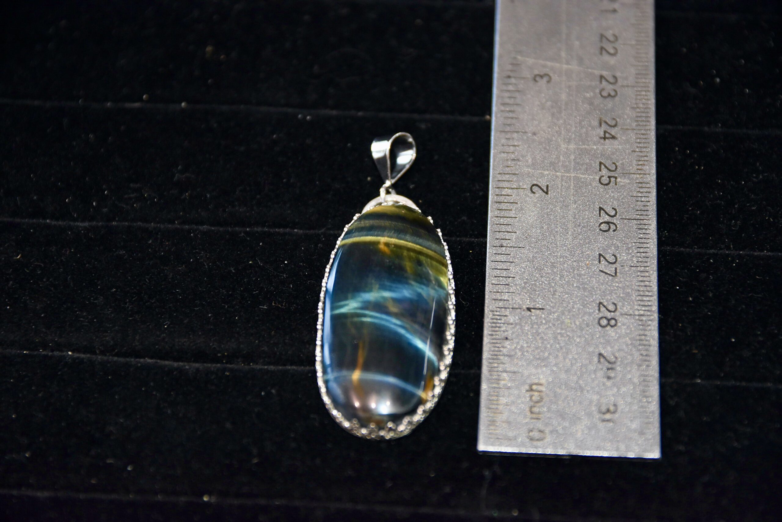 Here is an unusual stone. It’s called Blue Tigereye and Jake was given this stone by a lapidary friend. It has flashes of blue and gold as the stone turns in the light and is very appealing. The stone is set in sterling silver with a full silver back, a fancy sterling bezel with a sterling bail.
