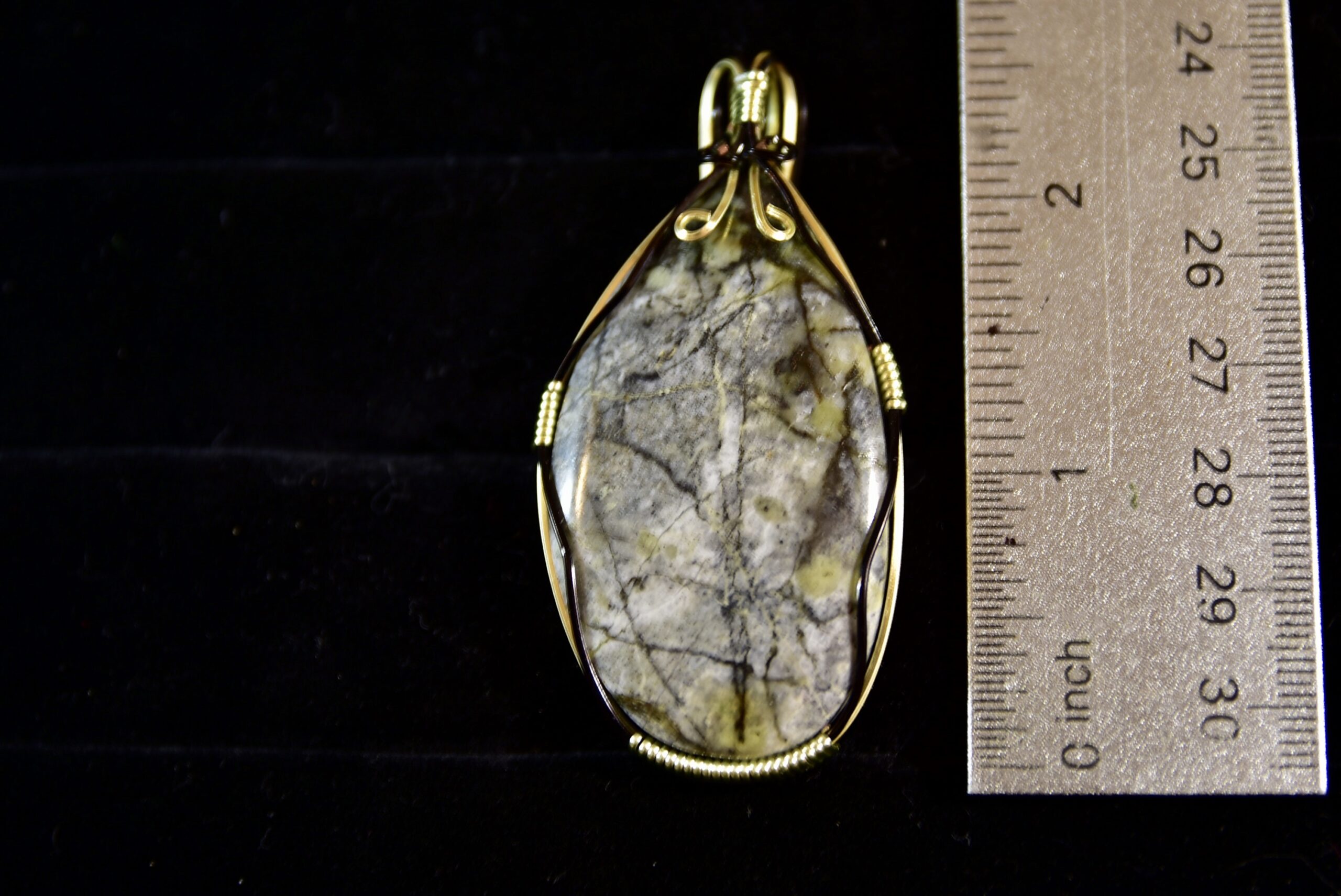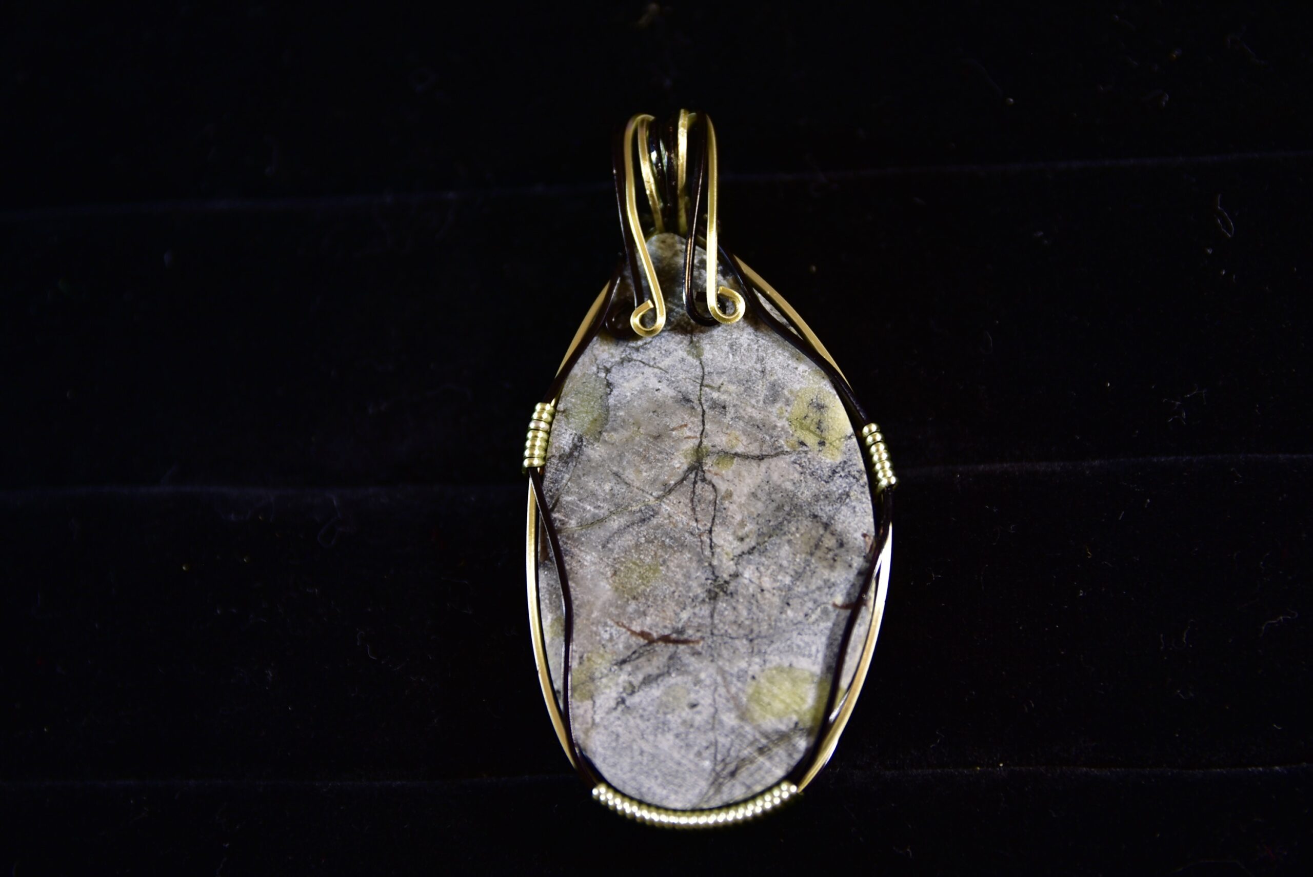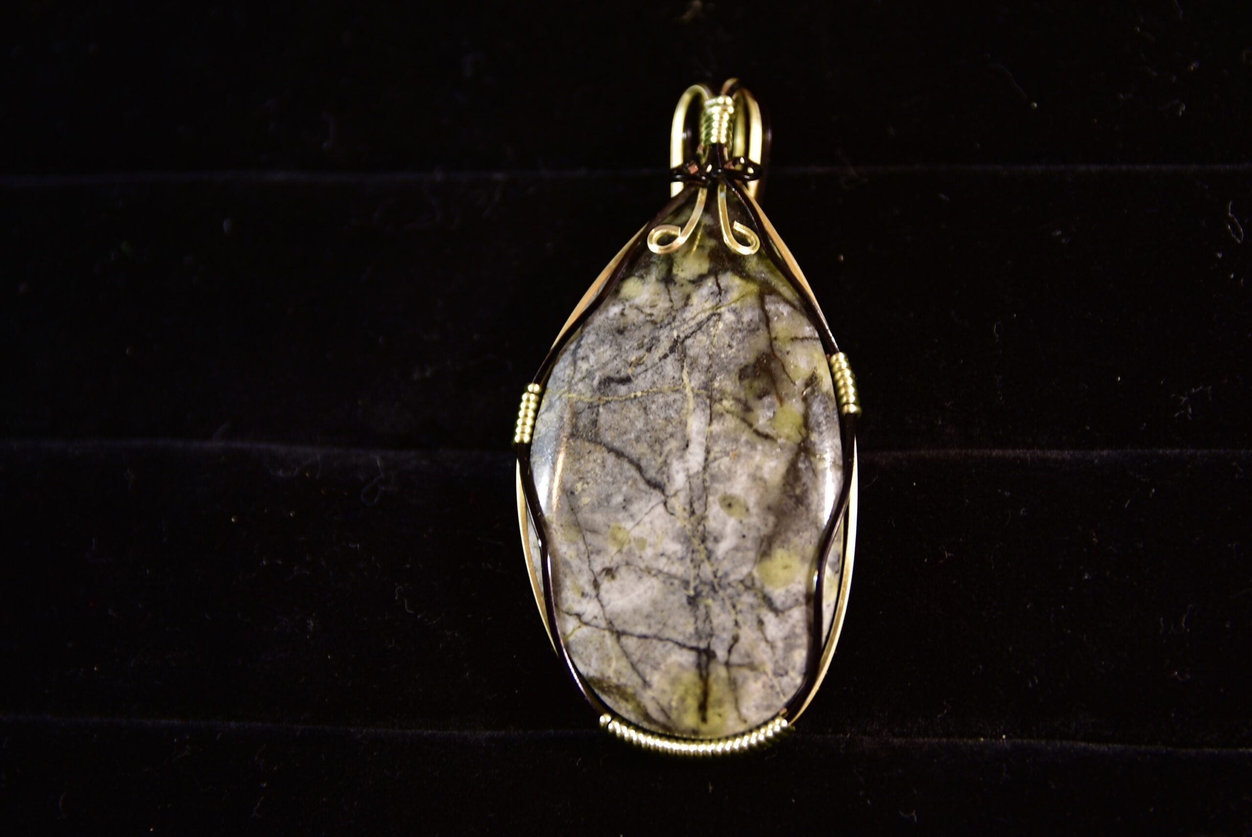When Jake takes his yearly trip west to find gemstones for his jewelry, he always likes to stop at an abandoned mine in Nevada to look for malachite and azurite. But this mine also has core samples left over from the mining days, and Jake loves to use pieces of the core samples in his jewelry as they contain great colors and patterns of the various minerals found there. In this piece, for instance you can see some green malachite mixed with the grey and black matrix rock. The setting is a black and champagne colored wire wrap.