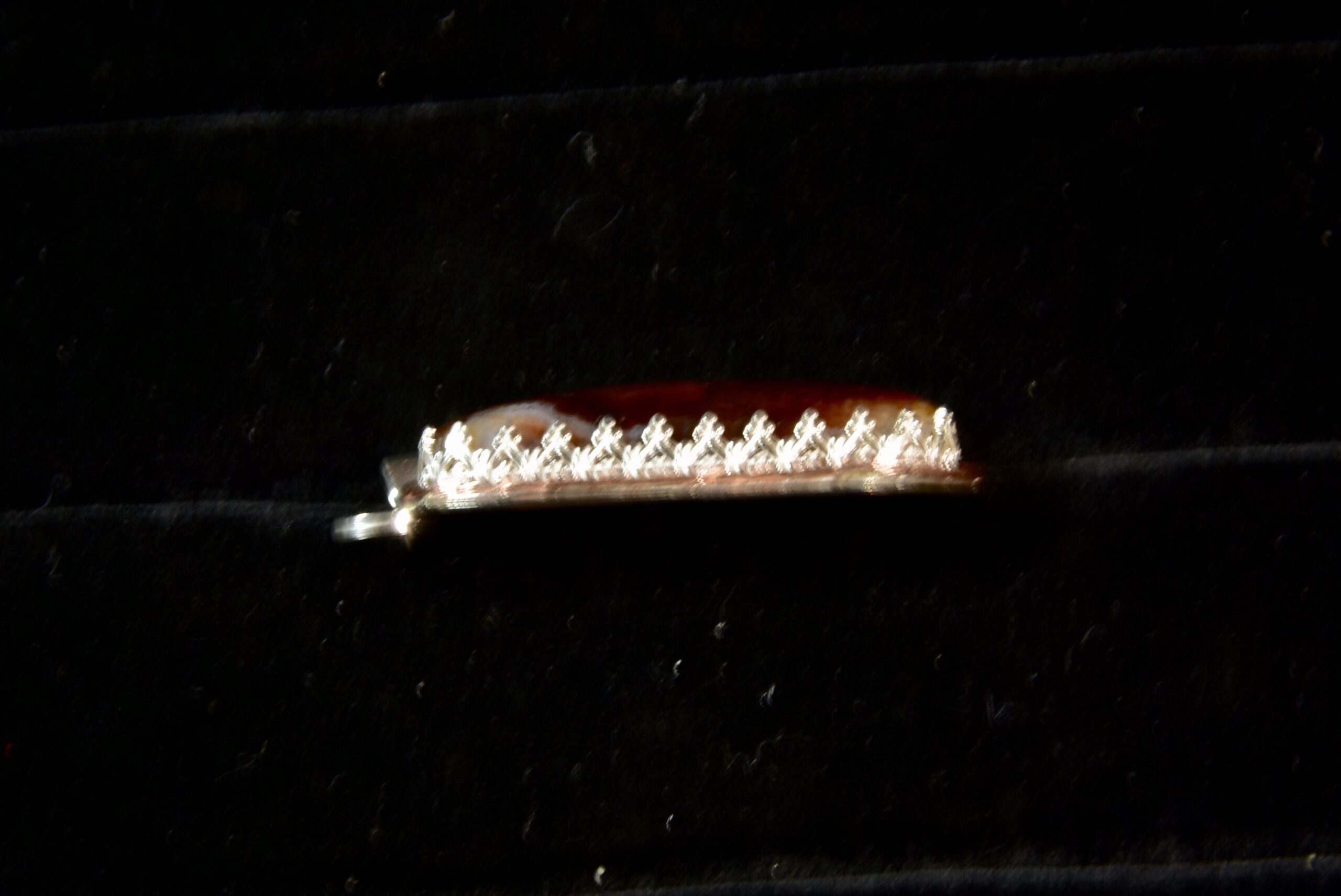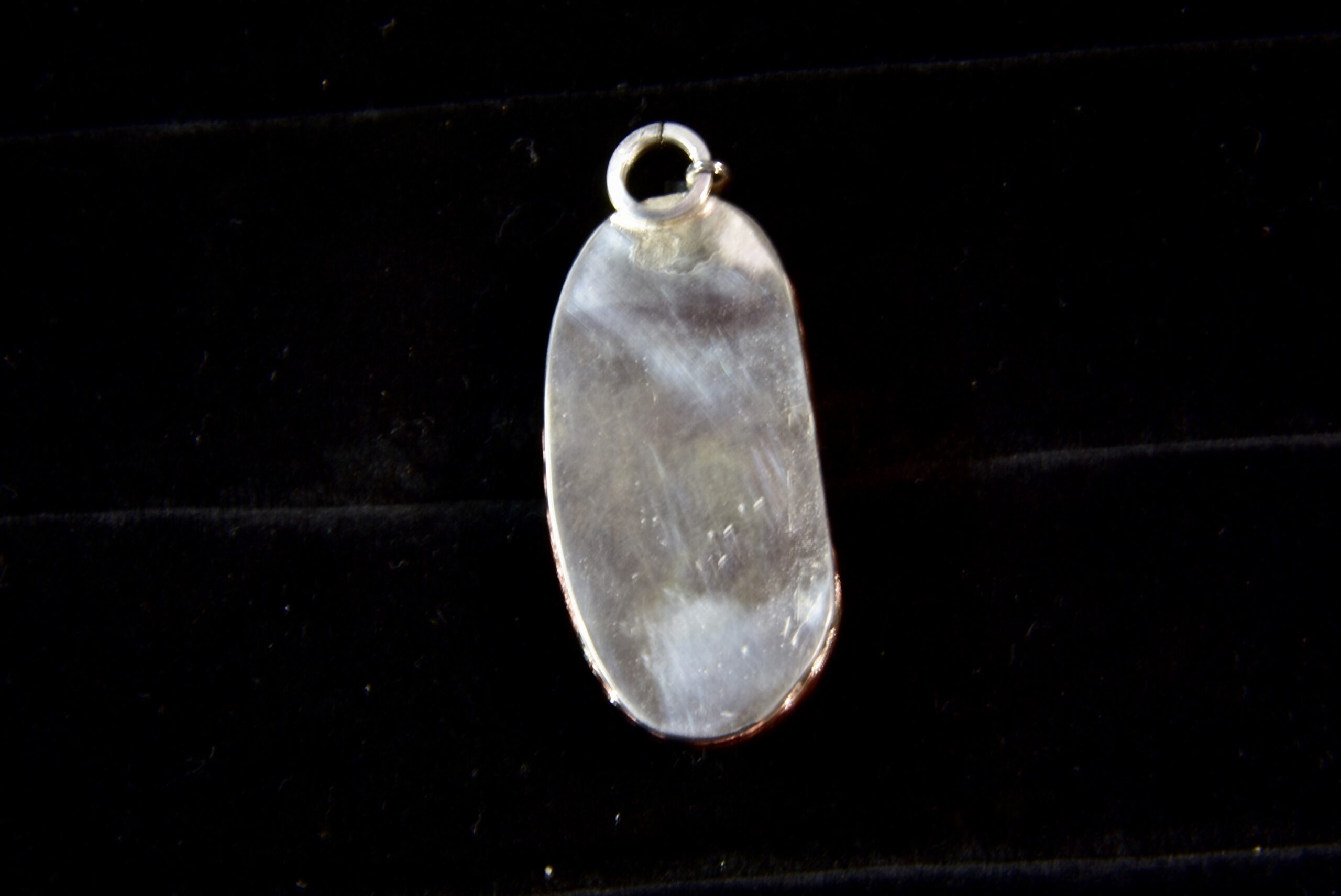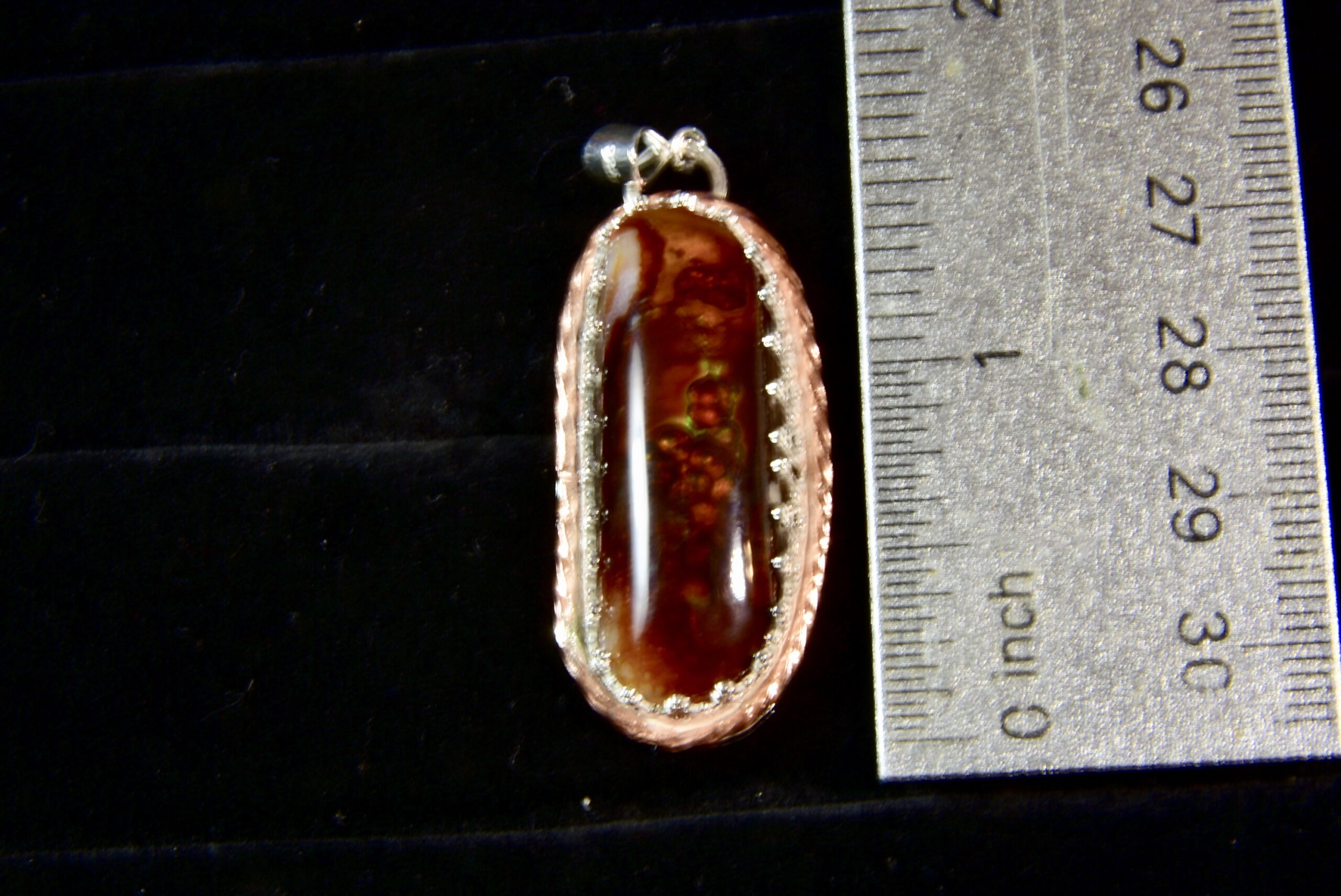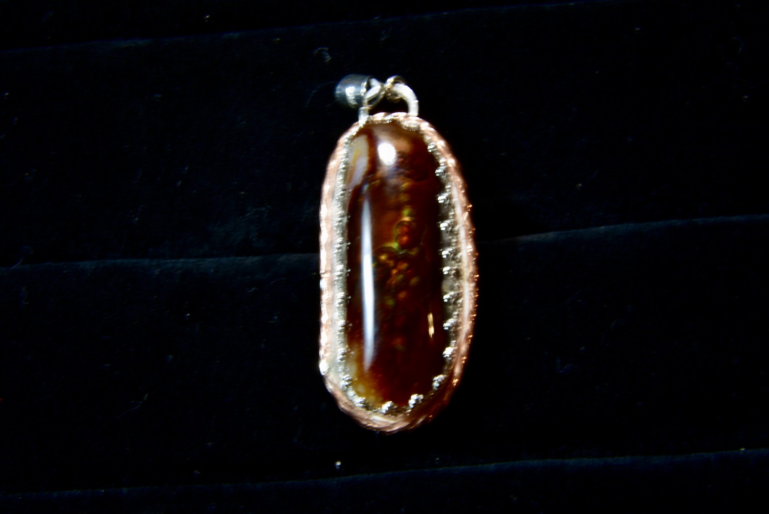 Jake finds his fire agate in a remote location in Eastern Arizona. Fire agate is considered a “precious” gemstone because of its rarity and its amazing colors. This stone has bubbles of colors beneath the brown agate that flicker as it turns in the light. The setting is sterling silver with a full silver back, and a fine silver fancy bezel encircled by a twisted copper wire accent and topped by a sterling bail.