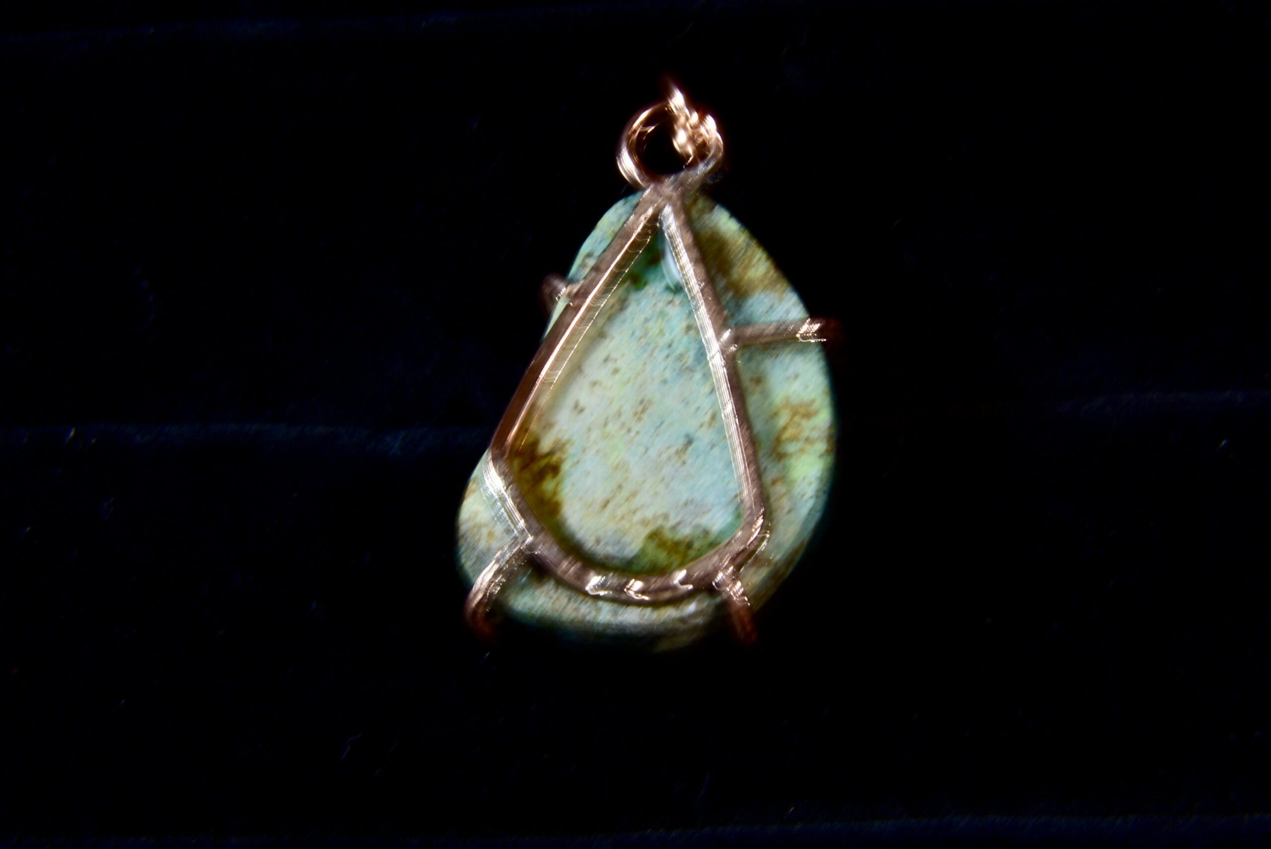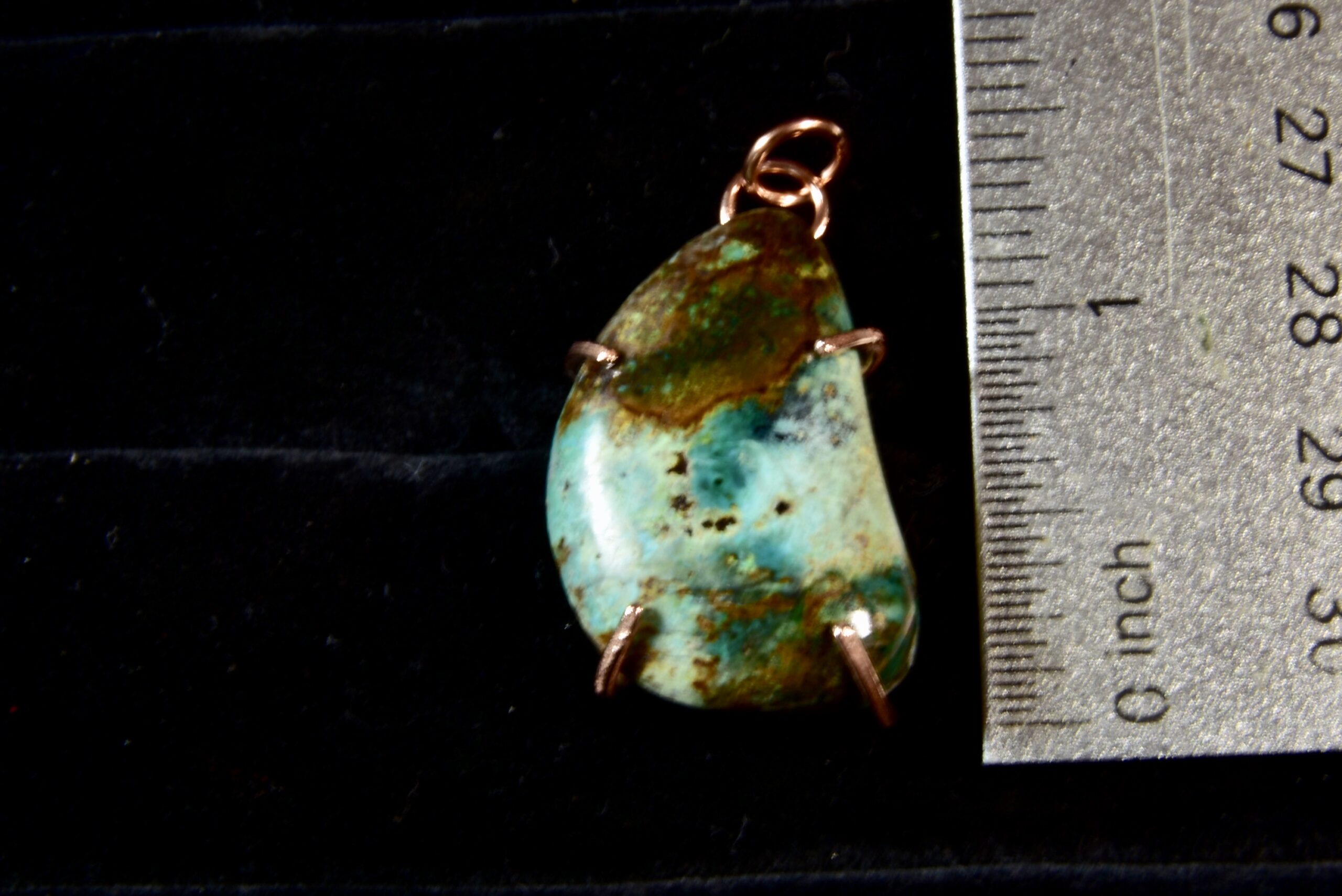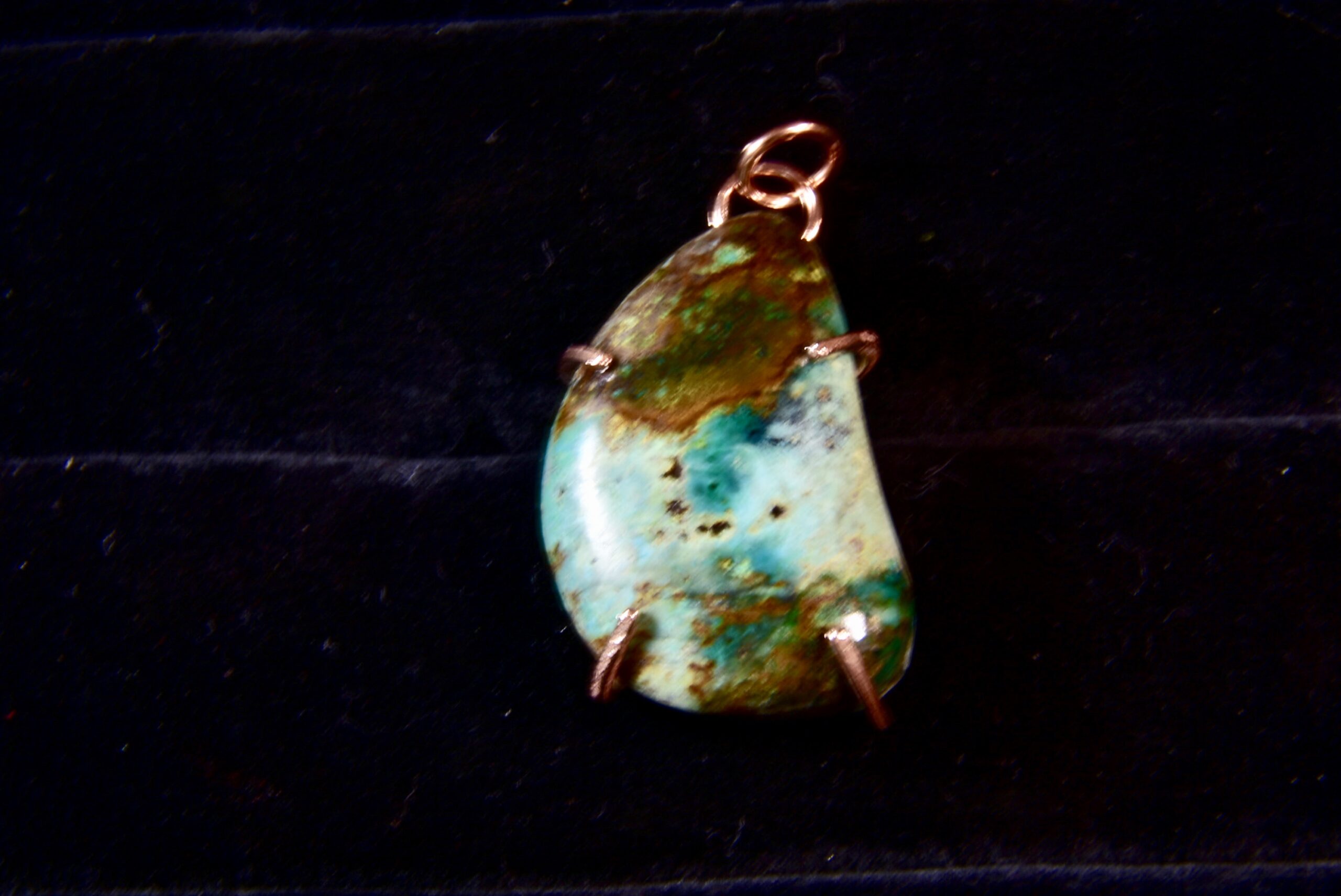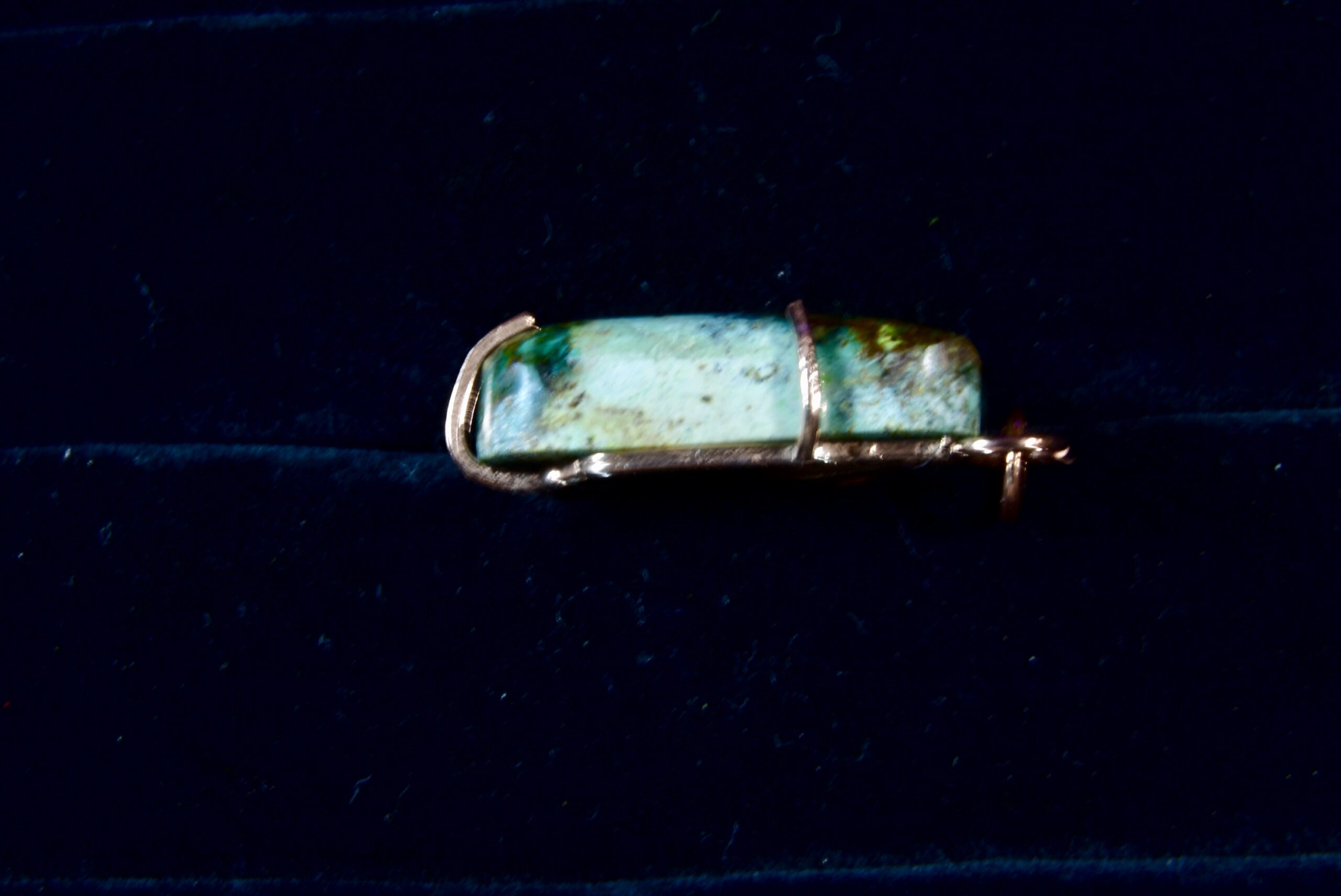 This piece of Malachite is from one of Jake’s favorite collecting spots, an abandoned silver mine in Nevada. There is a ton of Malachite and Azurite there, so much that sections of the mountains are bright blue and green. But, it’s not easy to find a piece with a high enough grade of gem that it can be cut and polished. When Jake cut the rock that contained this stone more than half of the stone was too porous and crumbling to cut into a finished piece. But the remainder produced this great looking stone. The stone has a streak of bright green Malachite running through the brown matrix rock. The setting is square copper wire framing the back with prongs to hold the stone in place.