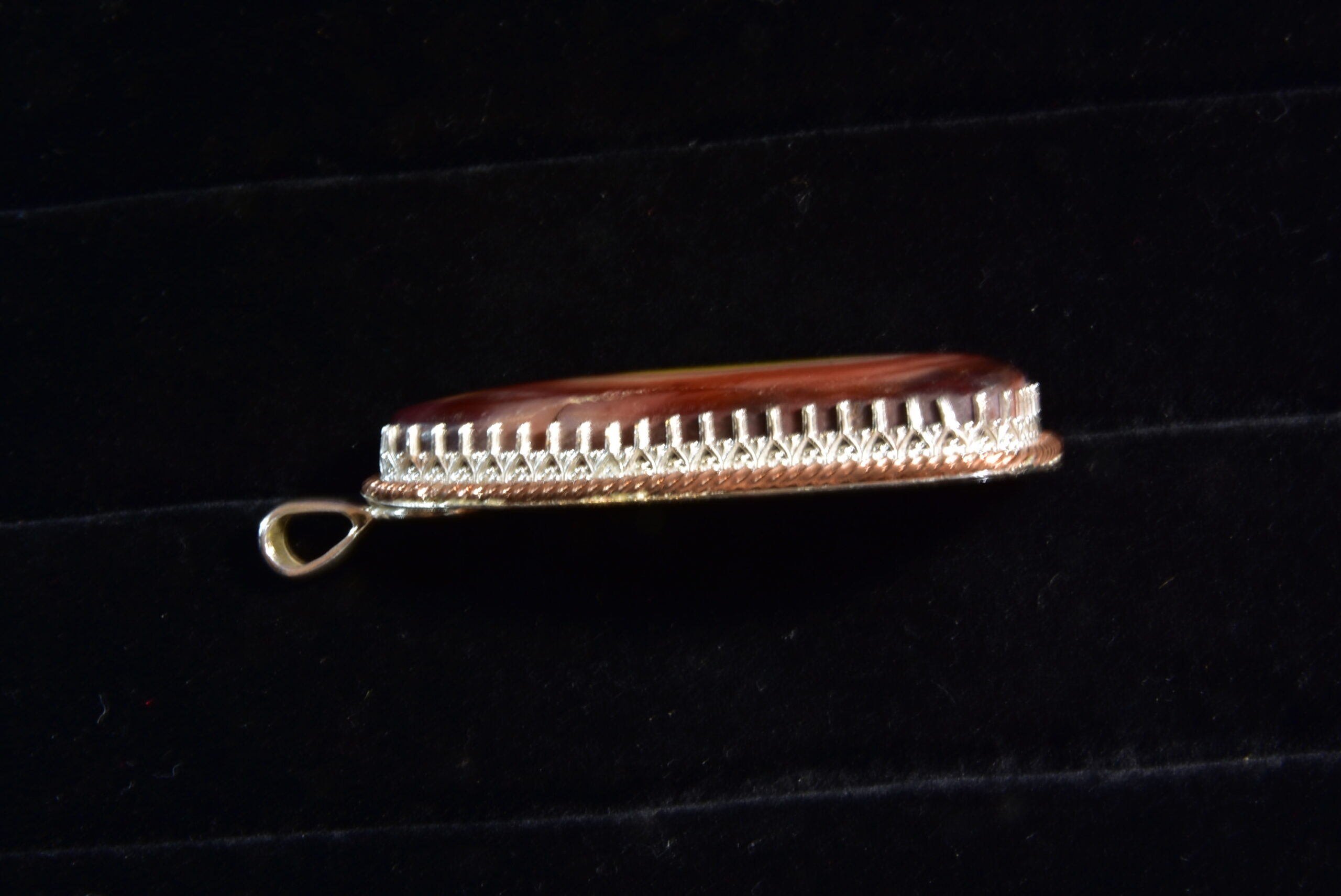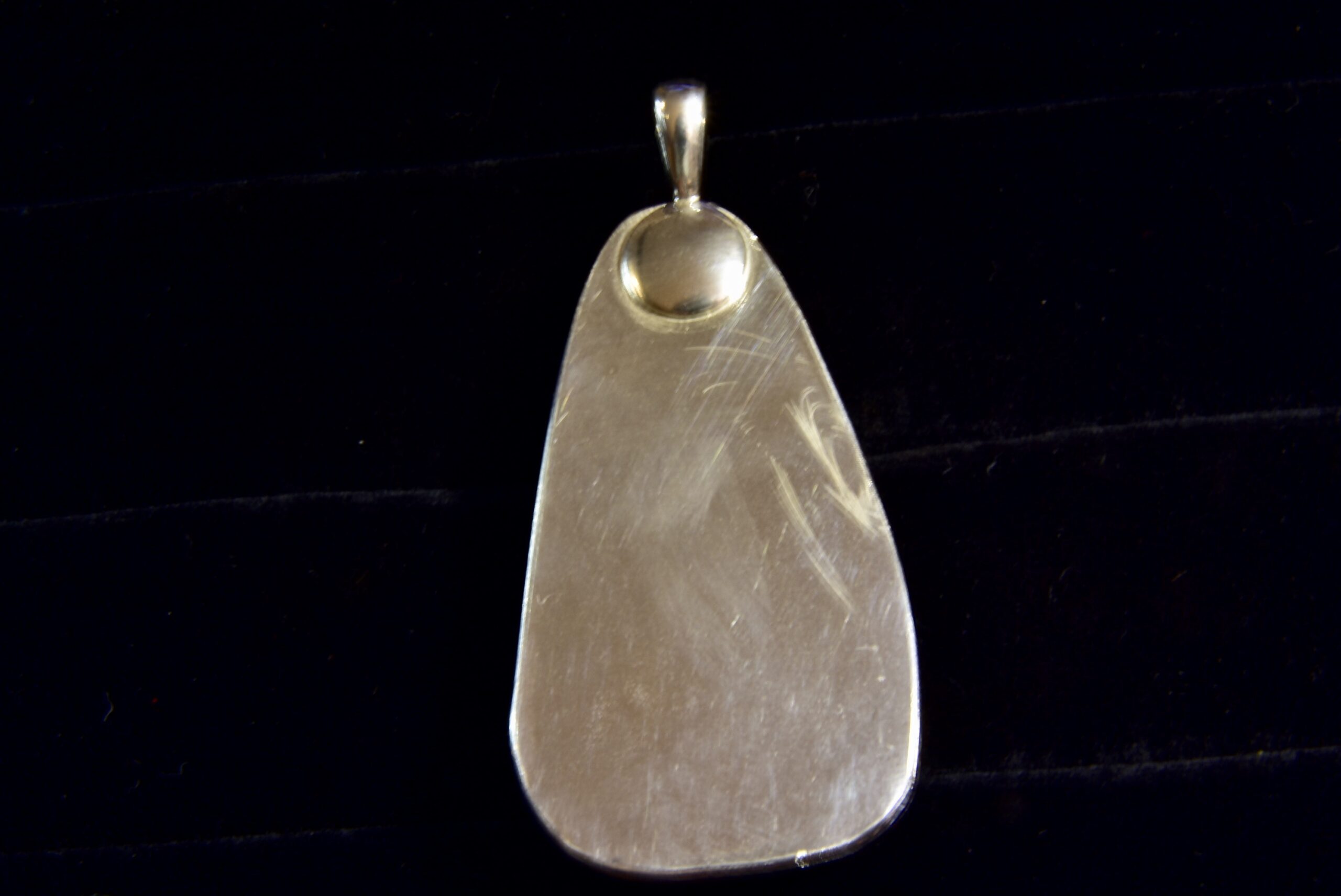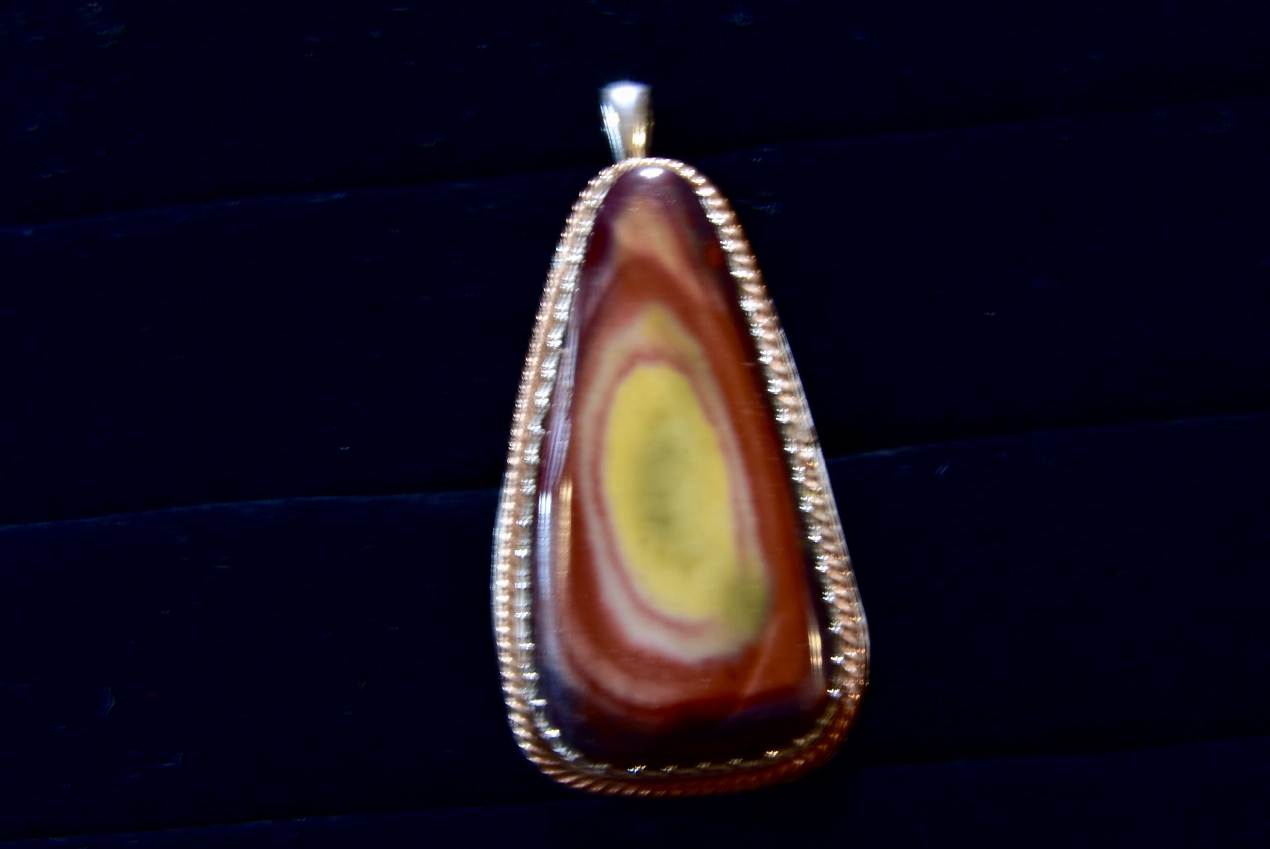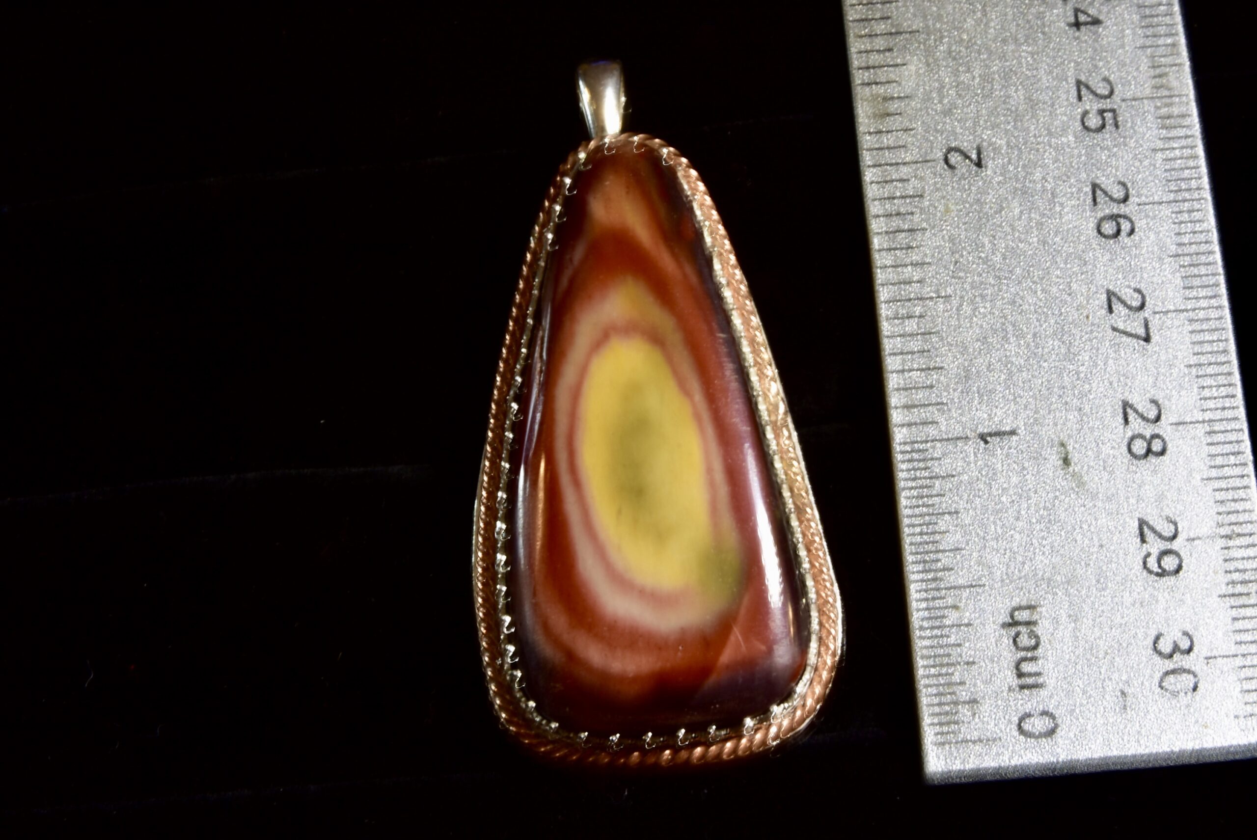 Mookaite Jasper is found only in Australia, but Jake saw the rock that produced this stone in a rock shop in New Mexico. When he saw the stunning colors in this rock, Jake decided that he had to buy it, even though Mookaite is very expensive. This particular stone is cut with a yellow bulls eye in the center, surrounded by tan, red, dark brown and purple tones for a sensational look. The setting is sterling silver with a full silver back, with a fancy fine silver bezel encircled by a twisted copper square accent wire and topped by a sterling leaf bail.