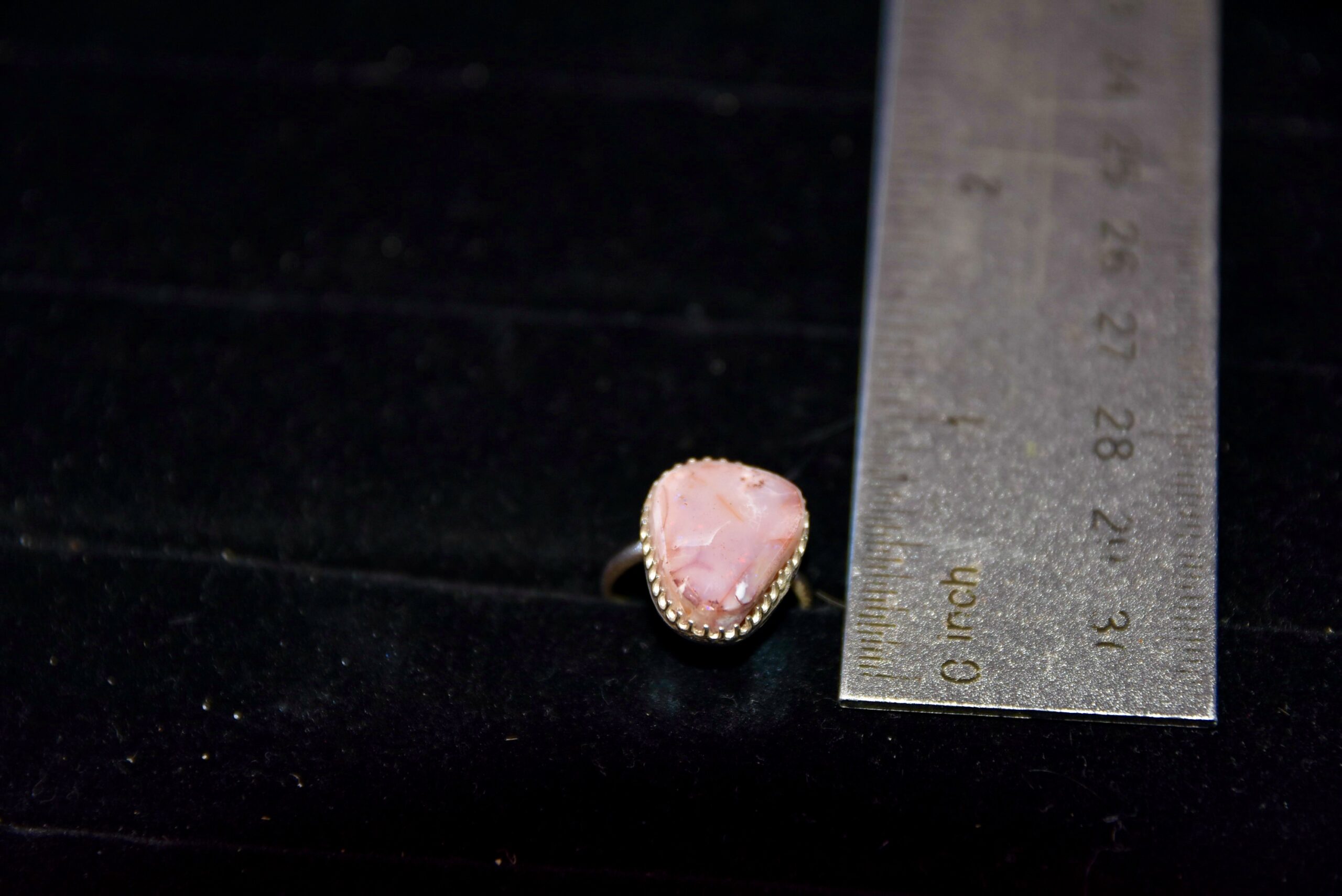 The picture doesn’t do it justice. When this stone moves in the light there is brilliant flashes of pink fire. Size 4 and a half.