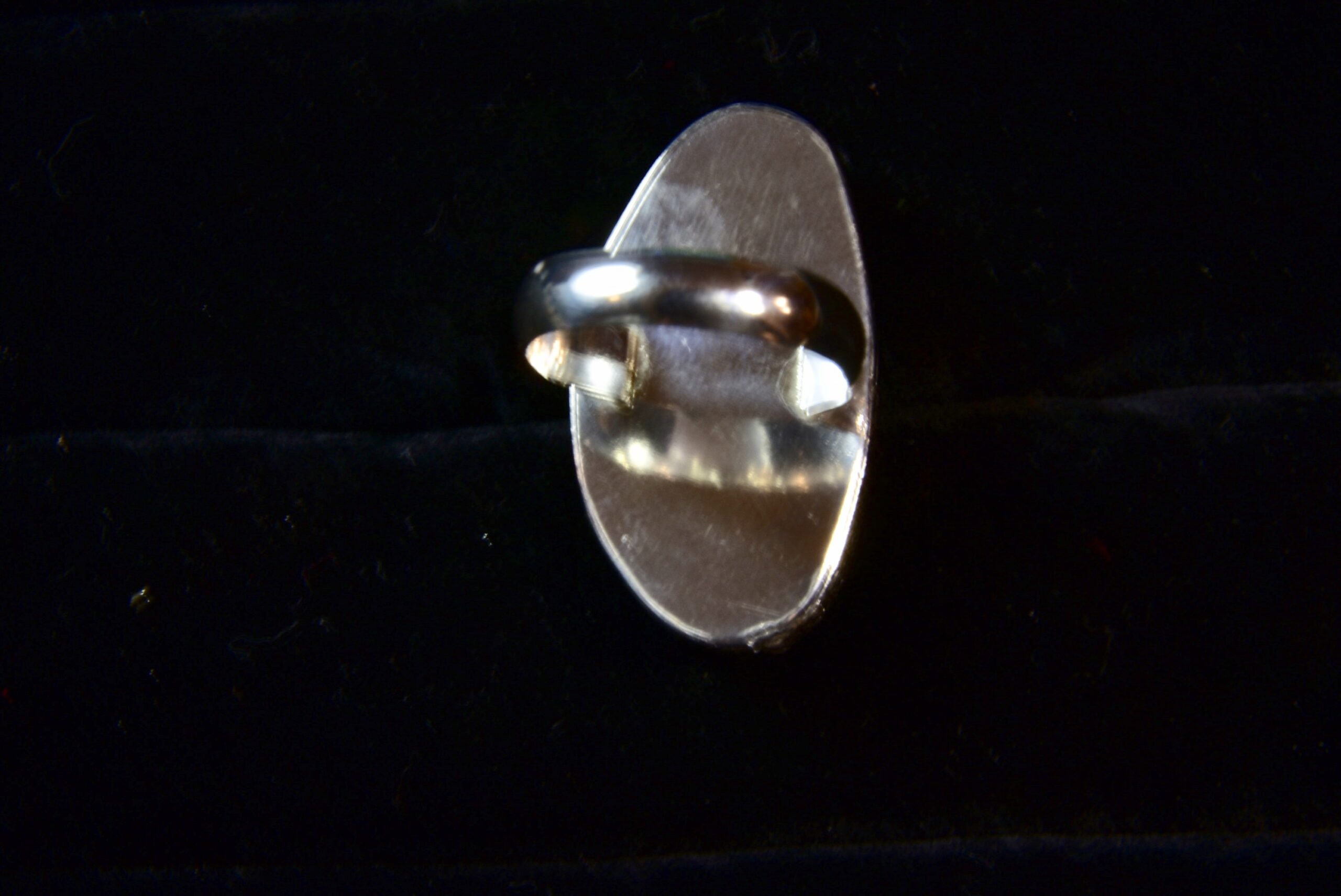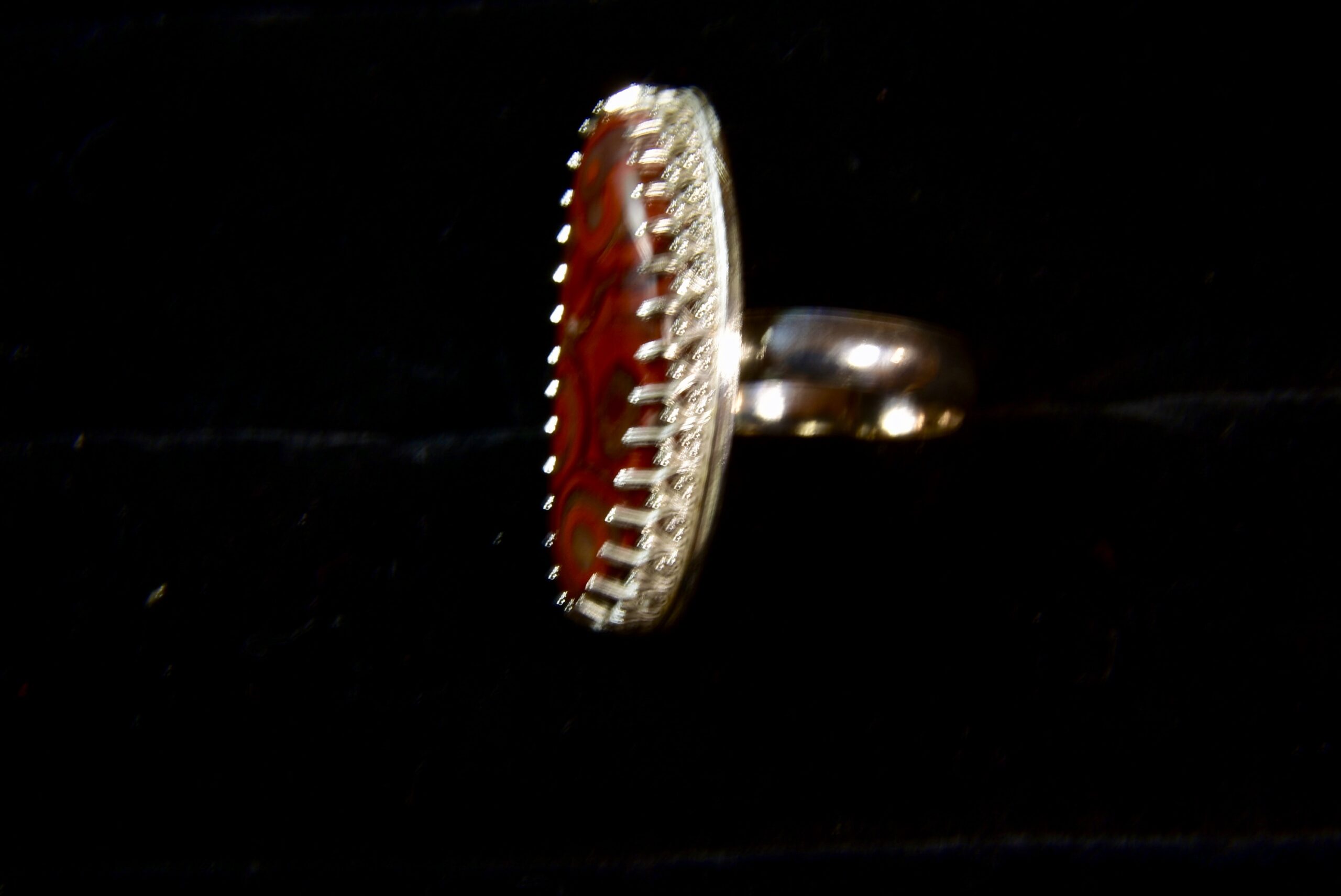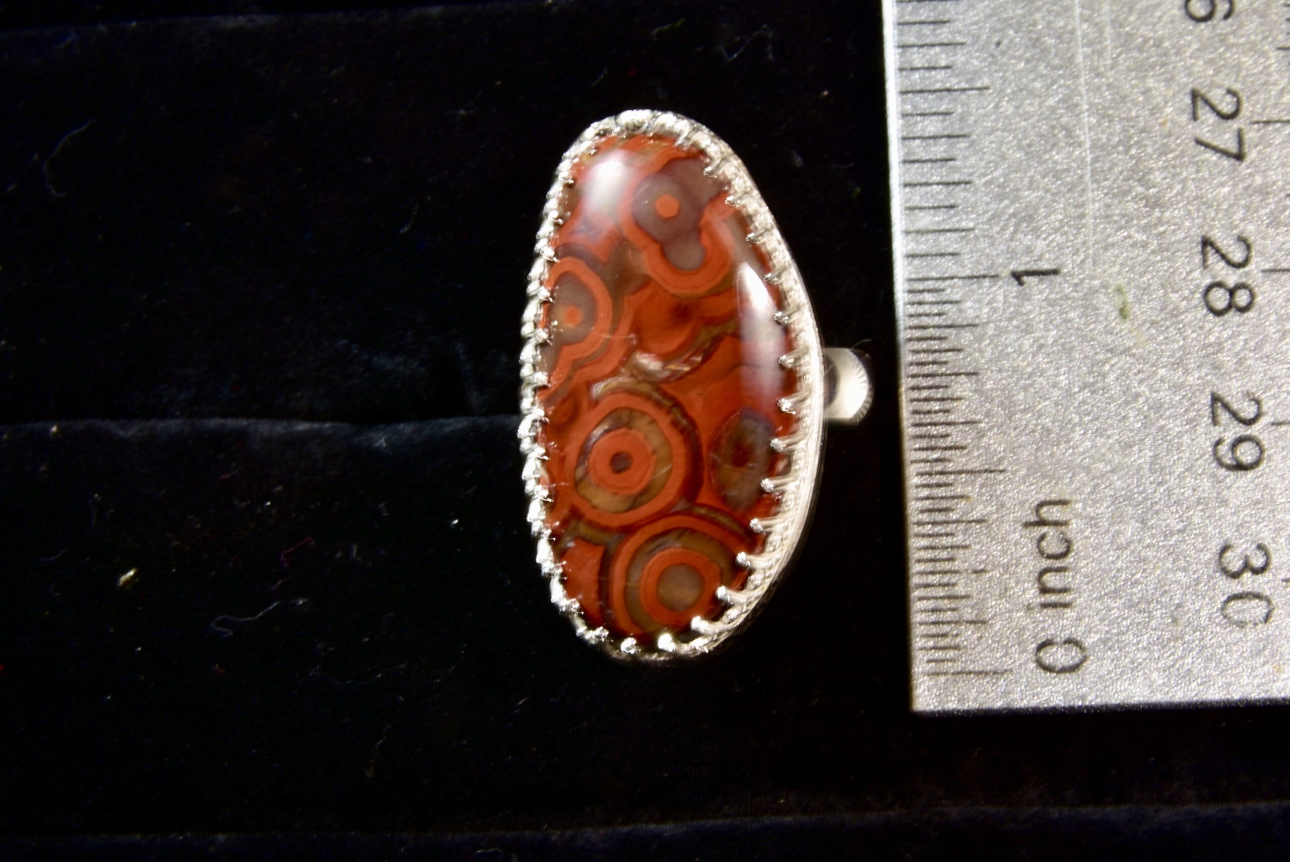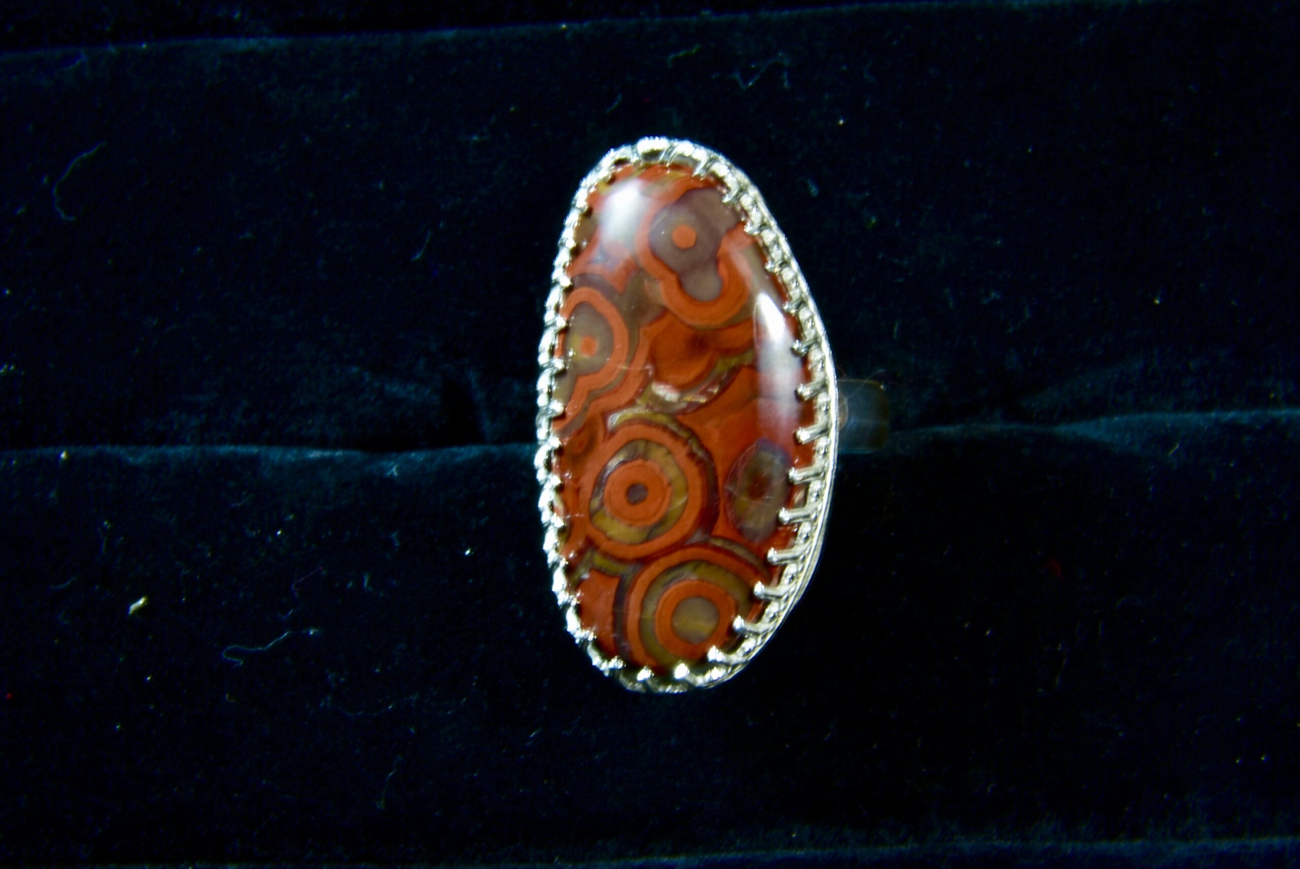 This interesting stone is called Poppy Jasper and the rock that produced this stone was given to Jake by a lapidary friend. The stone has fascinating patterns of red/orange and black, but it is hard to get a good stone from the raw material because it can be very porous, and Jake was only able to cut two stones from the rock. The setting is sterling silver with a fine silver fancy bezel and the ring stock is half round sterling wire. The ring size is 6 and a half.
