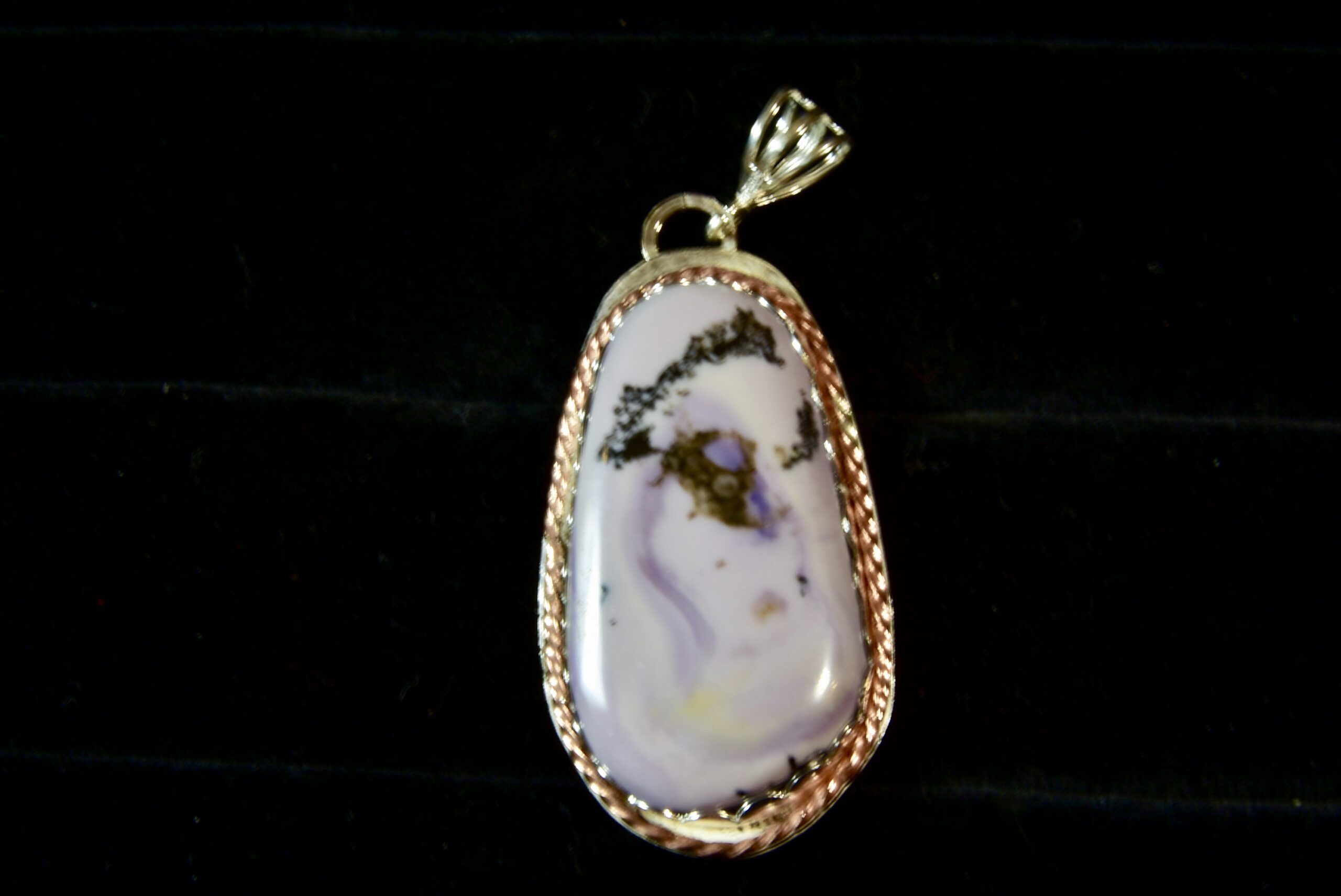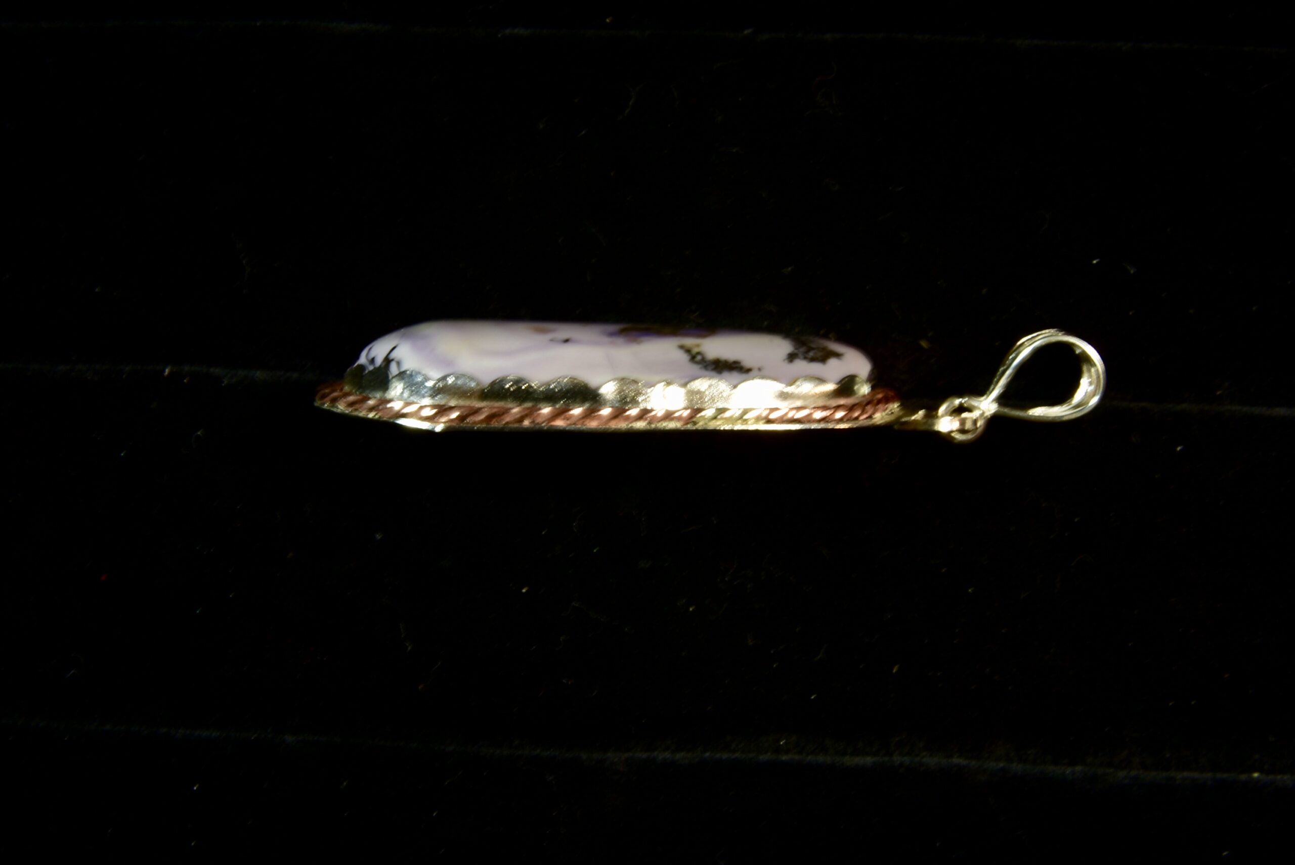 This is a sweet piece of Tiffany Stone that Jake found while out in Utah. Tiffany Stone only comes from one mine located in Utah, and it is very rare. The stone is highly prized for it wide array of colors and the patterns that they form. The rock that produced this stone looked very plain on the outside but because it was broken you could see the vivid colors on the inside. This particular rock produced stones with a lavender color, with darker purples and some black mixed in. The setting is sterling silver with a full silver back with a fine silver scalloped bezel surrounded by a twisted square copper wire as an accent, topped by a fine silver three pronged bail.