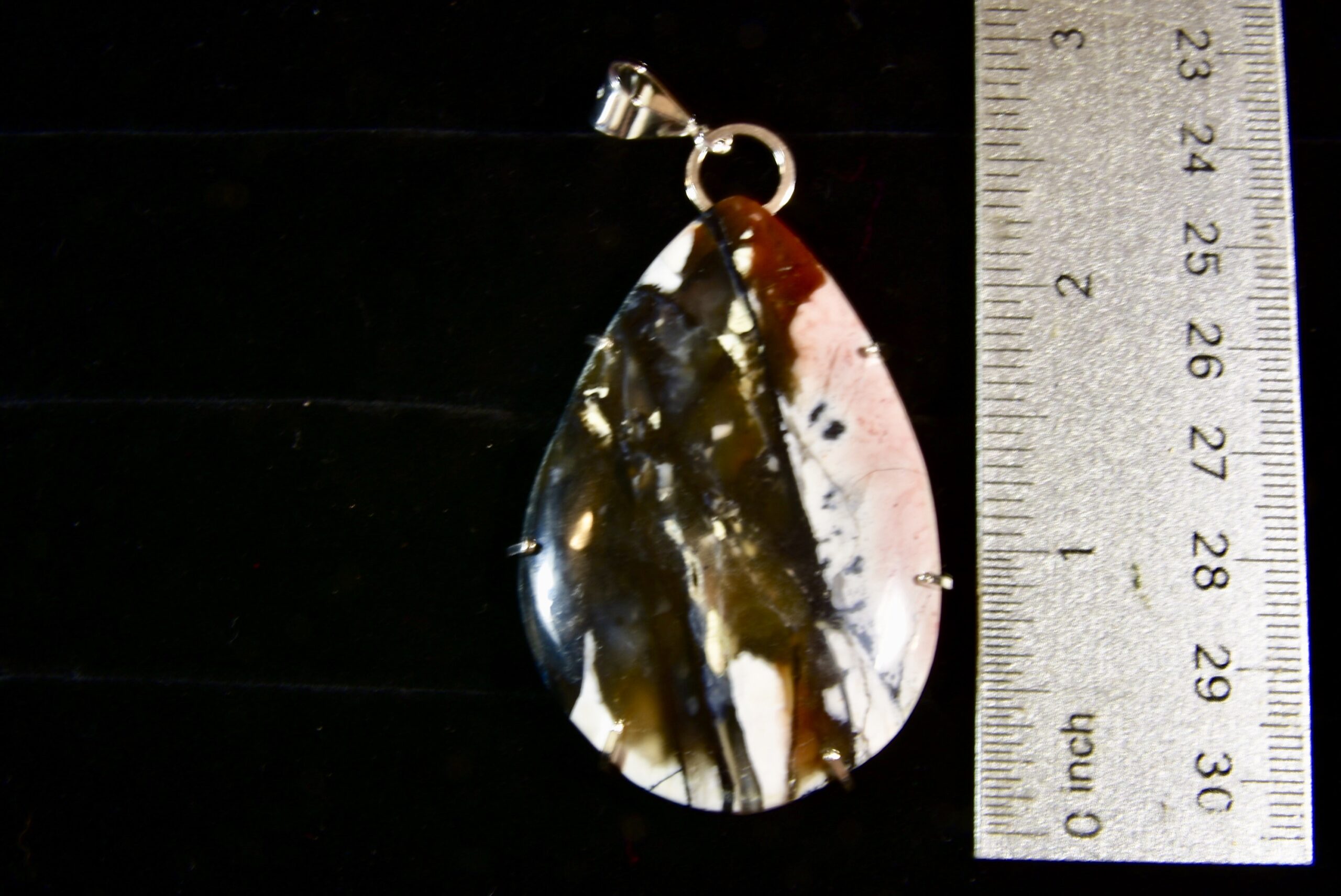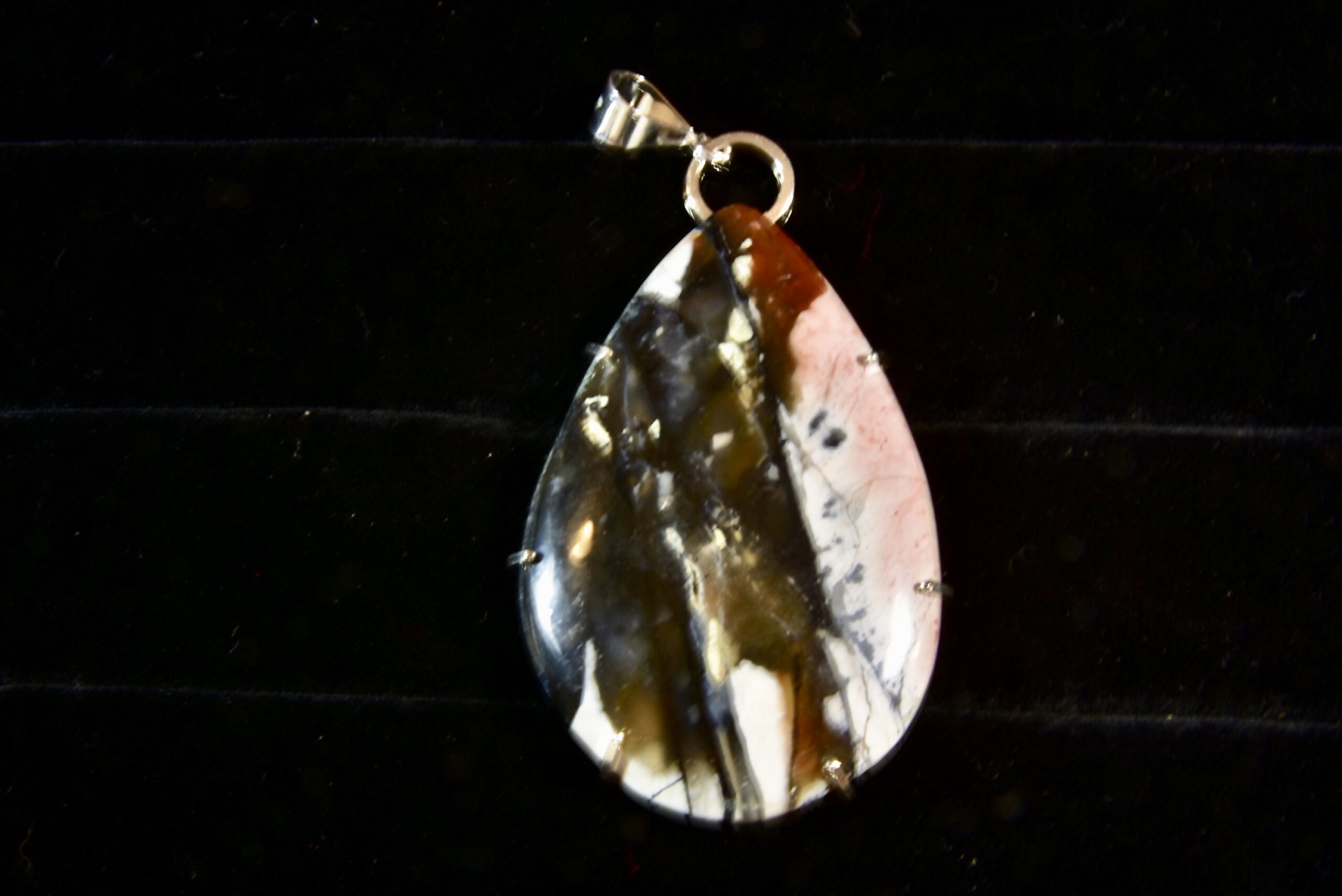This is a large, spectacular piece of Tiffany Stone that Jake got while out in Utah. There is only one mine that produces this beautiful stone, and it is in Utah, but the mine owners do not allow the public to dig there. The stone is extremely rare and hard to get. Jake has been able to find some raw Tiffany Stone in nearby tailings, and also in a local rock shop there, and that’s where this piece came from. Tiffany stone comes in a whole range of colors, and this stone has a lot of them including pink, purple, black, white and brown. The setting is sterling silver square wire framing the back with prongs to hold the stone in place, topped by a sterling bail.
