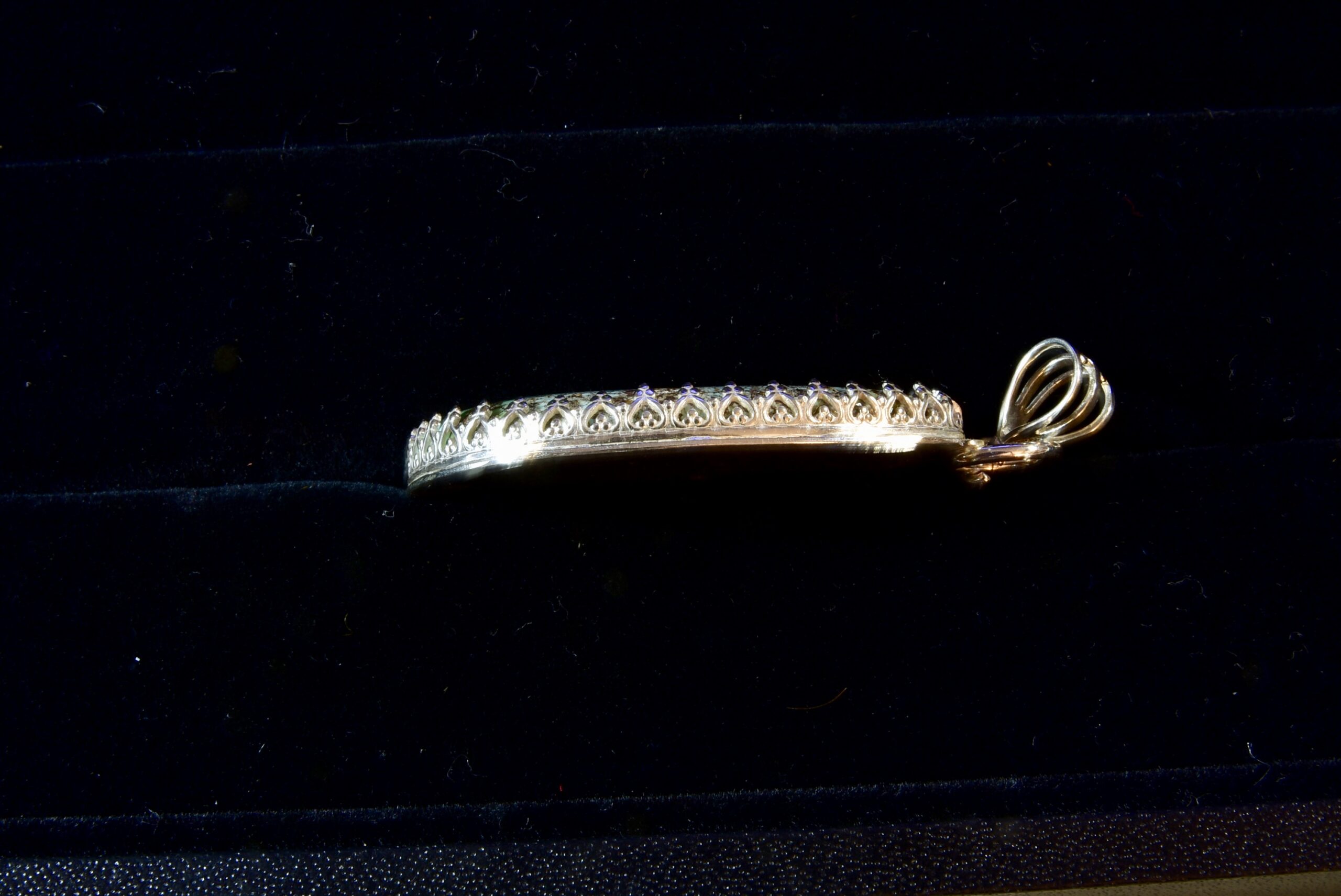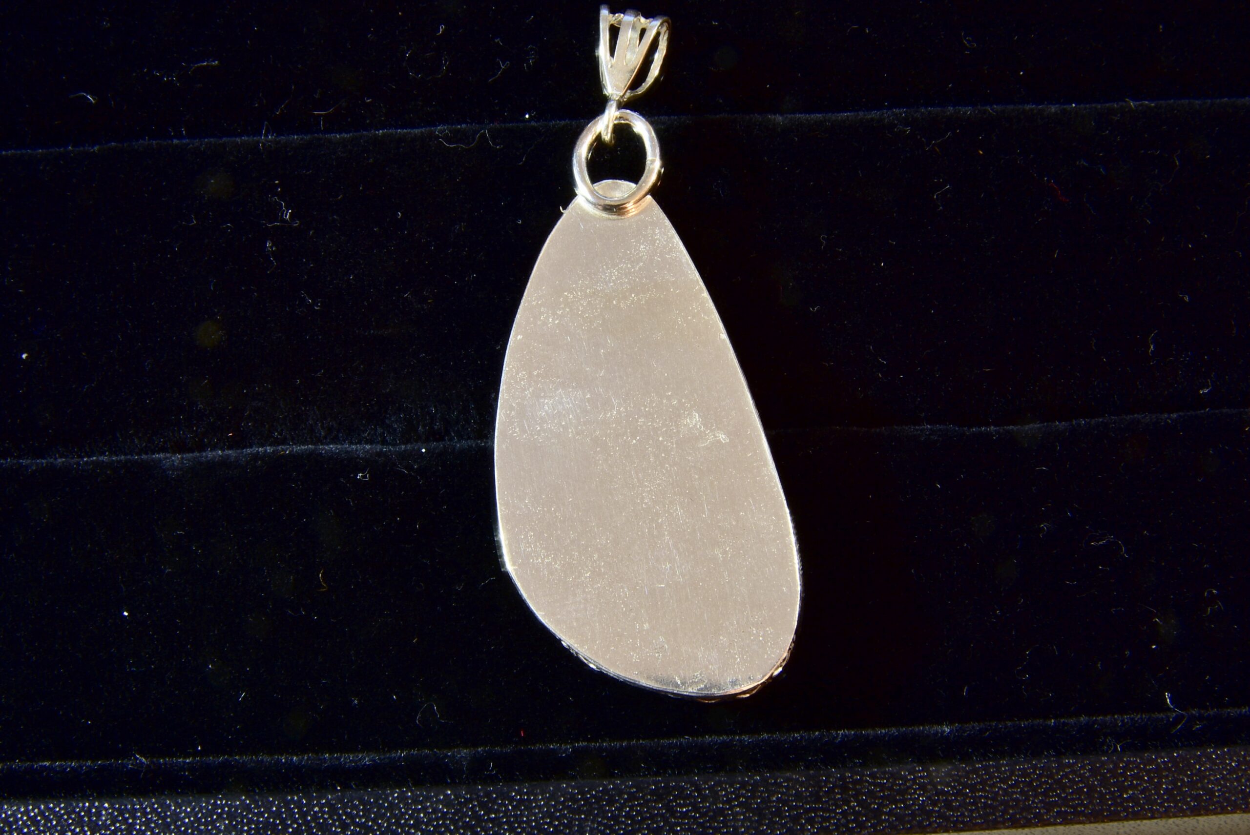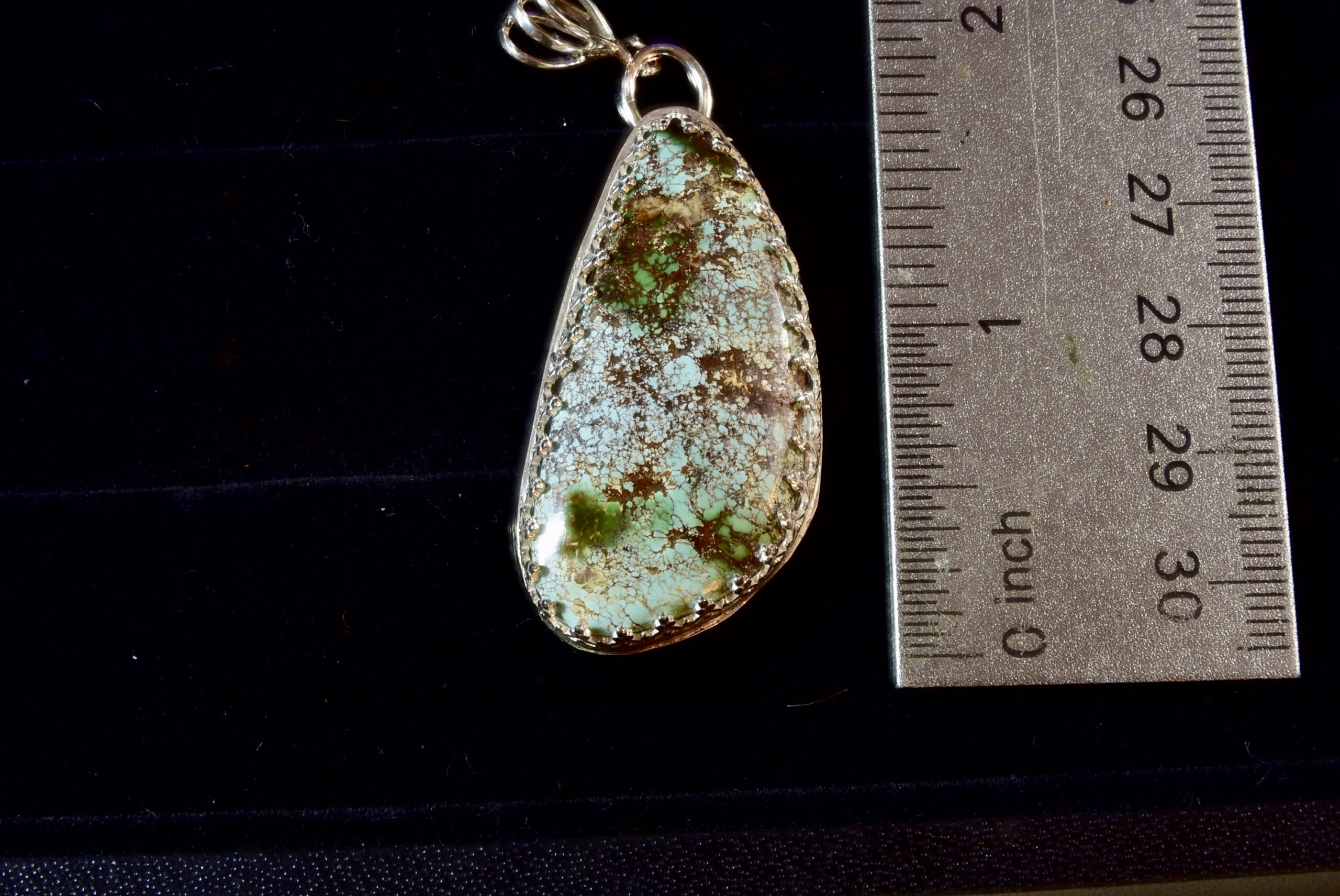 Royston turquoise is one of Jake’s favorite gemstones, and this piece has a very unusual look. The Royston mine is in Nevada, and is one of only a handful of American mines that still produce turquoise. The rarity of turquoise has driven up the price quite a bit. The Royston mine owners used to allow the public to dig through the tailings at the mine but have decided to discontinue access to the public. are was lucky enough to visit this mine on two occasions before it was closed to the public, and he still has some beautiful raw turquoise from those visits to work with. This piece has robin’s egg blue mixed in with the brown matrix stone and a few areas of green as well. It is set in sterling silver with a solid silver back, with fancy bezel wire and a special argentium silver bail.