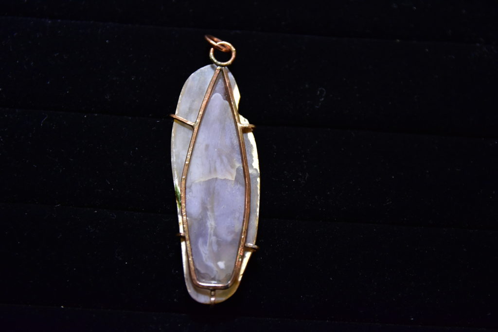 This is a pretty piece of agate that Jake found in the desert near Moab, Utah. It is multi colored and has a light purple cast with some whites and darker tones, flanked on the edges by the matrix rock. It is set in a claw setting using copper square wire and prongs to hold the stone in place.