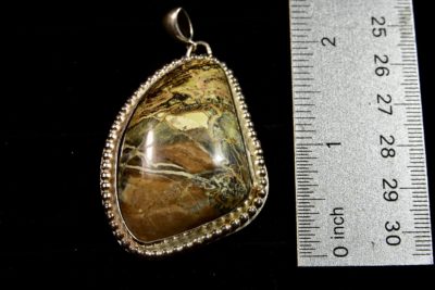 Here is a piece of a core sample that Jake found at an abandoned mine in Nevada. A core sample is obtained when the miners drill down with a round pipe and bring up a section of rock, then split it open to see if it contains the precious metals they are seeking. When the mine was abandoned, the core samples were left behind for Jake to find. They contain unique and exquisite patterns of color from all the minerals present there.This piece is set in sterling silver with a solid silver back, a sterling bezel surrounded by a sterling bead wire as an accent.