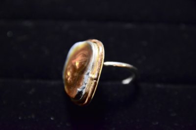 This is a great piece of fire agate from a stone Jake found in the Arizona desert. It has flashes of red, orange and green in the stone, and is framed by Chalcedony on one side. The setting is sterling silver and has a twisted copper wire accent ring. The ring stock is a solid sterling silver round wire and the ring size is 8 and one half.