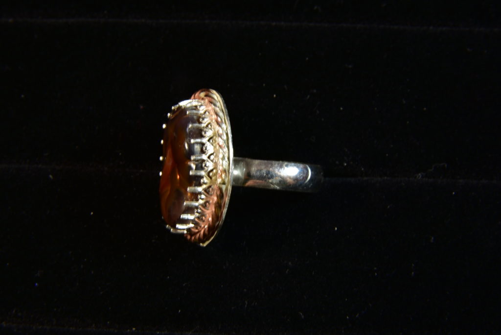This is another piece of fire agate that Jake found in the Arizona desert. This one has bright red color and is very unique. Fire agate is very difficult to cut and polish, as the colors are in different levels in the stone so the piece must be worked with a hand tool, and it takes days to finish cutting and polishing the stone. It is set in sterling silver with a fancy sterling bezel surrounded by a twisted copper square wire as an accent. The ring shank is made with half round sterling wire and the ring size is 7 and one half. A magnificent stone!