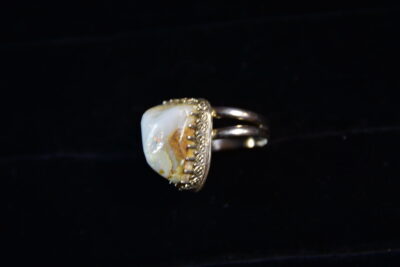 This is a piece of raw fire opal that comes from the Spencer Opal mine in Idaho, one of Jake’s favorite spots to visit.  The owners allow the public to dig through the mine tailings and take home the precious fire opal that they find.  This piece was left raw by Jake, it was only cut away from the larger host rock and shaped.  Jake wanted to leave it as he found it because it was such a pretty piece in its raw state.  You can see flashes of red and green fire as the stone turns in the light.  The setting is sterling silver with a fine silver fancy bezel with a split half round sterling wire ring stock and the ring size is 6 and one half.