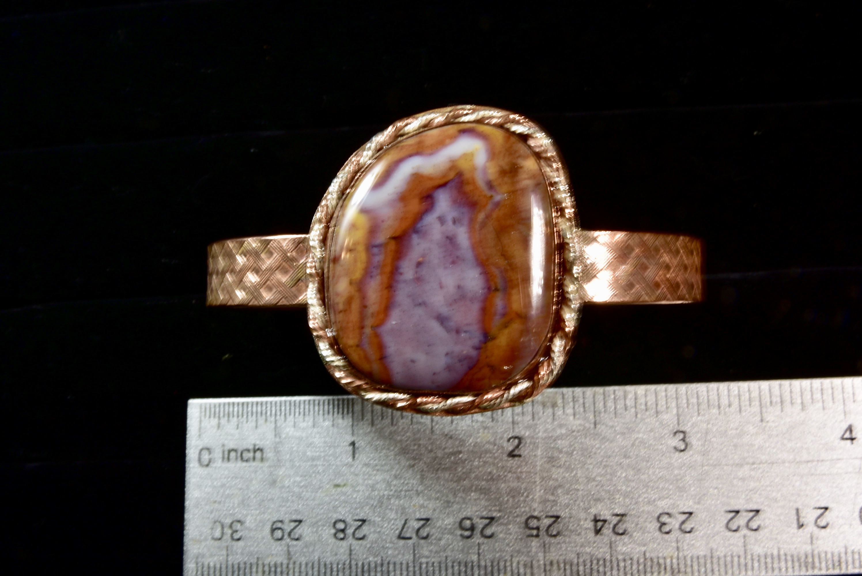 This bracelet has a large, exceptionally beautiful piece of Gem Chalcedony that Jake dug up while in a remote section of Nevada. This spot contains private claims of Gem Chalcedony, and it’s the only place where it can be acquired, but the claim owners are kind enough to allow the public to dig for a fee. This special type of chalcedony comes in many kinds of colors and patterns, and this stone has a beautiful purple center surrounded by browns and black. The setting is copper with an accent ring that is intertwined twisted copper and silver wire, and the bracelet has a nice pattern.