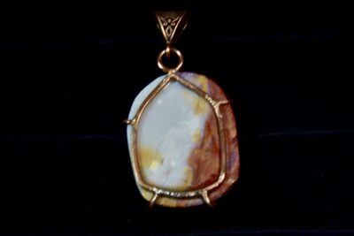 Gem Chalcedony is a rare stone found only in one spot in the Nevada Desert.  Jake was told about the area by a local rock shop owner.  The area is privately claimed, but the owners will allow the public to collect the stones for a fee.  There are five separate claims, and each one produces different color stones.  This one has red, yellow and white with a beautiful pattern that splits the stone.  The setting is copper square wire framing the back with prongs to hold the stone in place and topped with an antique copper bail.