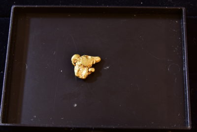 A nice gold nugget smoothed by the waters of Jack Wade creek. The weight is 2.9 grams.