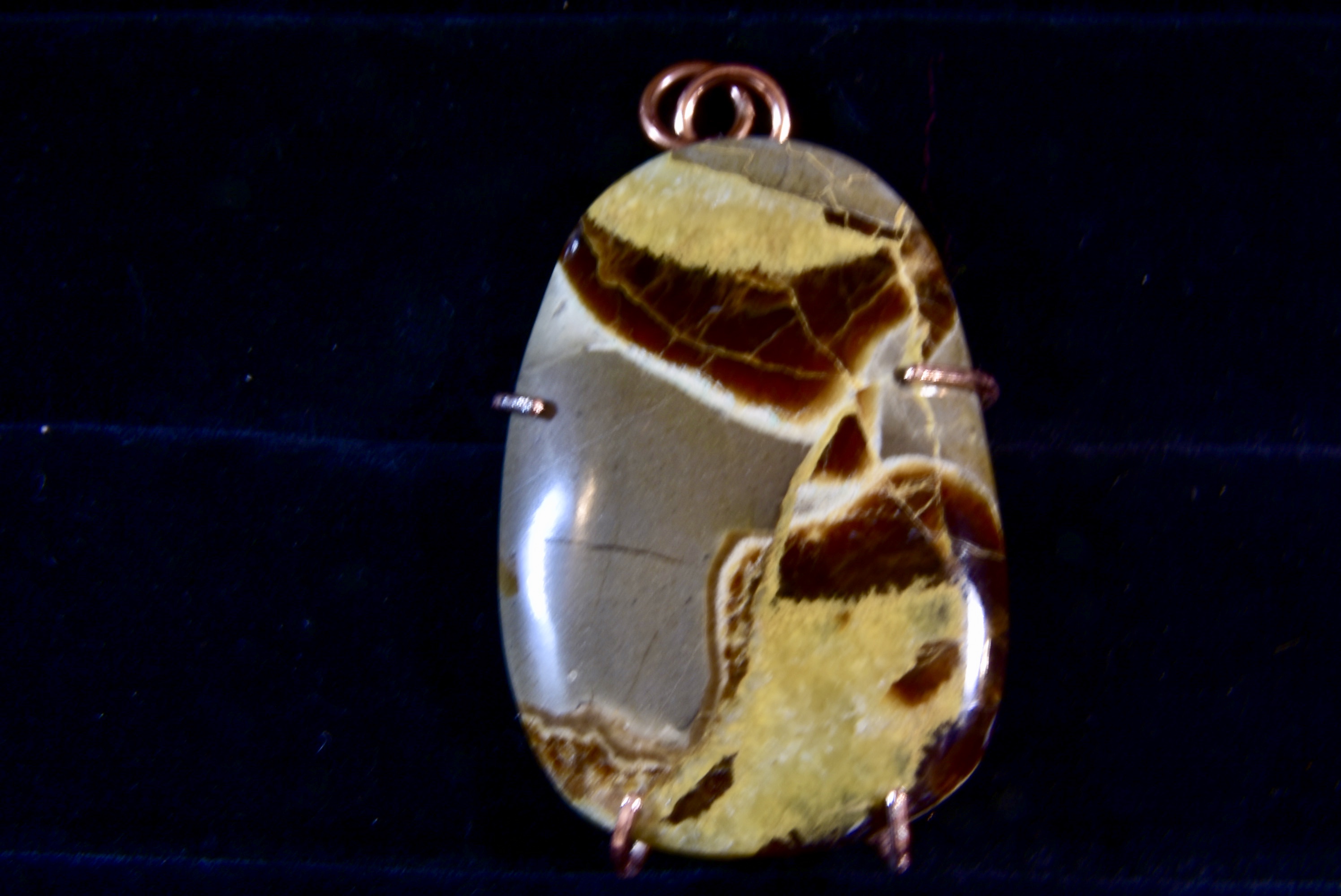 Jake found the raw stone that produced this piece while out in Utah which produced some great Septarian nodules. These nodules are sometimes called “dragon eggs” because they are shaped like an egg and have a pattern that looks like dragon scales. Despite that, Septarian is thought to be a calming stone that helps to ground you in stressful times. This stone has dark brown sections mixed with grey and yellow and is set using copper square wire framing the back, with prongs to hold the stone in place.