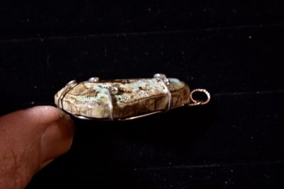 This is a piece of Turquoise that Jake dug up at the Royston Turquoise mine in Nevada. The Royston mine is one of the only turquoise mines still producing in this country, and the fact that turquoise has been become increasingly rare is what has driven the price up so much. Natural, untreated turquoise like Royston is very hard to find, and that’s why Jake was so disappointed when the Royston mine decided to end its public tours. This piece is light blue to almost white with the brown matrix rock mixed in. The setting is sterling silver round wire with curled prongs to hold the stone in place.