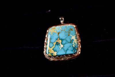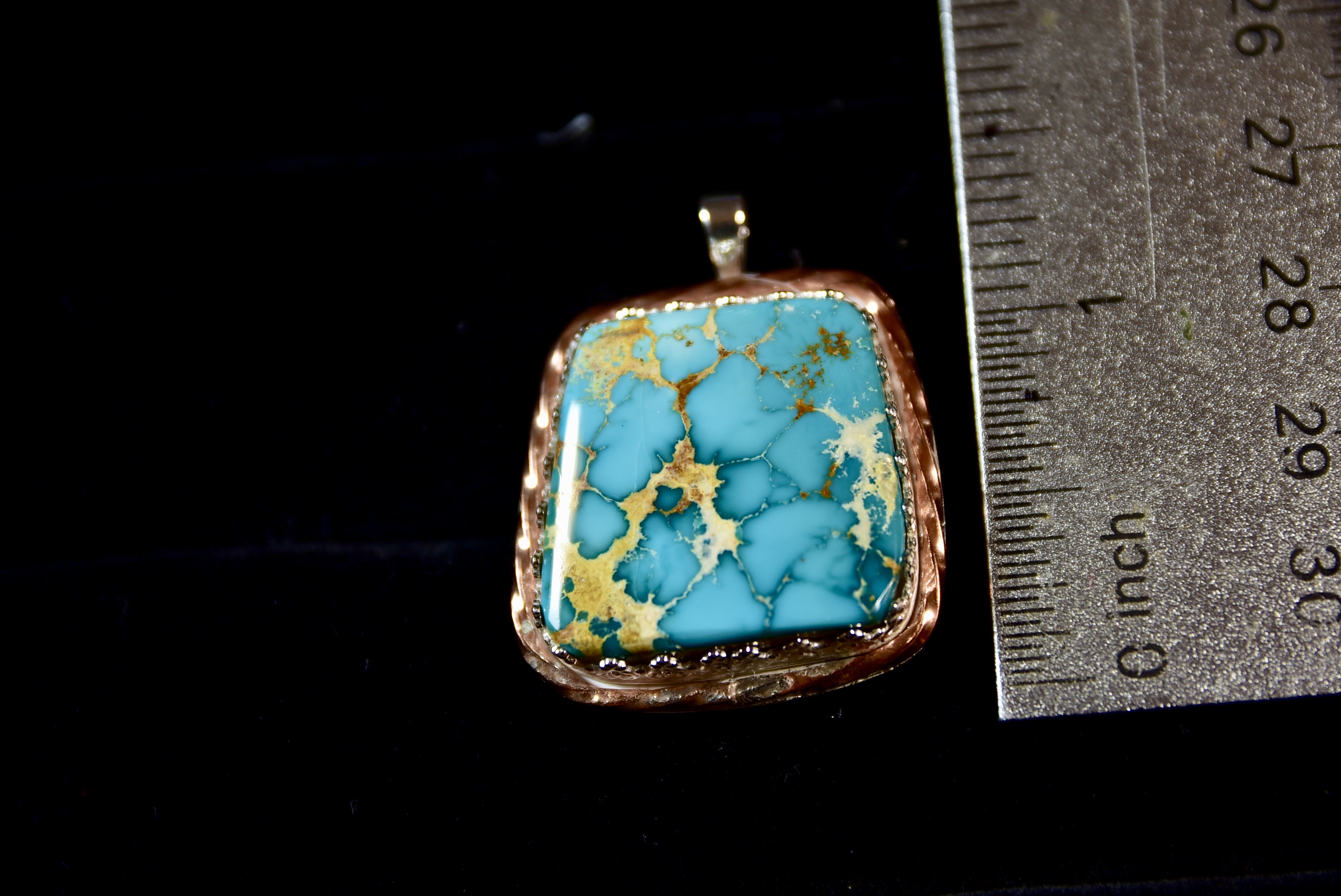 This is an exquisite piece of turquoise that Jake dug up at the Royston Turquoise Mine in Nevada. The Royston Mine used to allow the public to dig through the mine tailings for a fee, but has now barred the public from any further digs. But Jake was able to go there a couple of times and has a stockpile of this turquoise from his visits there. You can see from the other turquoise jewelry that this turquoise is one of Jake’s favorite stones, and it was Royston turquoise that first got Jake interested in making his own jewelry. Royston turquoise is famous for being some of the finest turquoise to be found anywhere and this piece is a great example. It has amazing color and a spiderweb pattern that is extremely hard to find. The setting is sterling silver with a fine silver fancy bezel encircled by a twisted copper square wire accent and topped by a sterling bail.