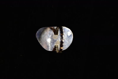 This stone is a piece of turquoise from the Royston Turquoise Mine that Jake found before the mine was closed to the public. Royston turquoise has a wide range of color ranging from dark greens to light blues, and is very hard for turquoise, so it needs no treatment to stabilize it. The color of this piece is deep blue with a green highlight running through it with small bits of the matrix rock for contrast. The stone is set in sterling silver with a scalloped sterling bezel, and a twisted flat wire ring shank. The ring size is 6.