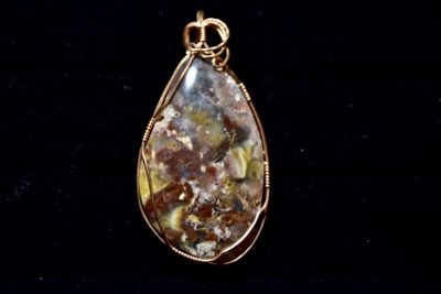 This stone is from the mountains of central Utah. The area around there is rich with minerals, and is a rockhounding paradise. In the spot where Jake found this stone there are deposits of pretty agate, and you could see where others had chiseled agate out of the ground, but there was a lot of stones on the surface too. This stone has great colors and patterns, and is wire wrapped in square copper wire, making a very nice piece.